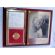 - z grawerowanego zdjęcia i cytatu, na złotym laminacie umieszczonym obok medalu na podkładzie,
