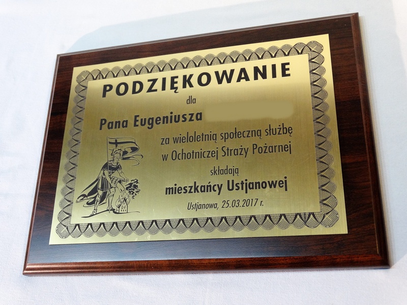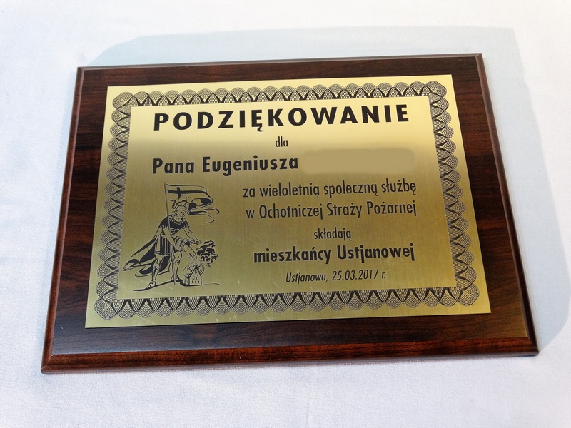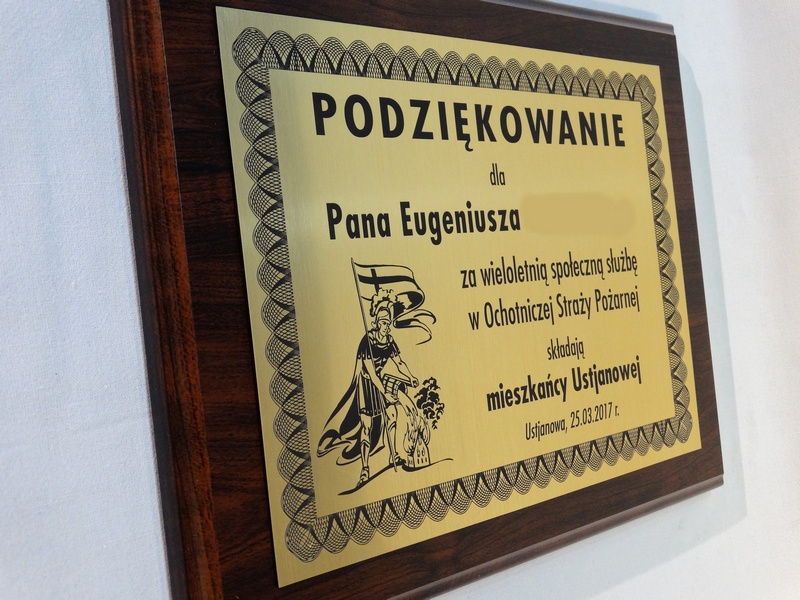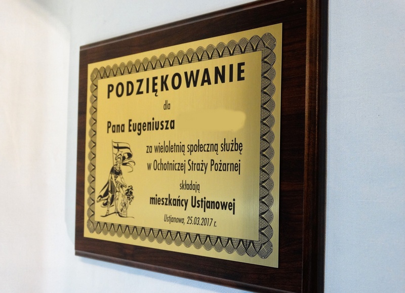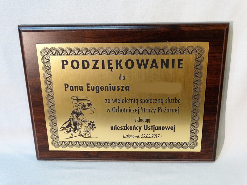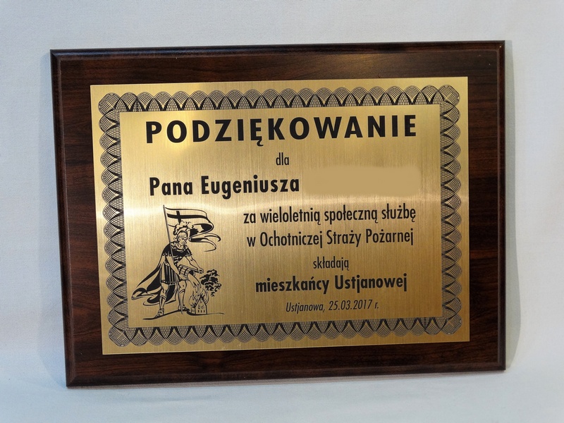 Dedykacja, grafiki lub zdjęcia i logotypy grawerowane są laserem na złotym laminacie grawerskim.