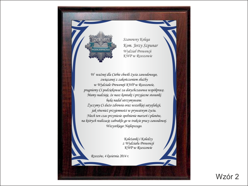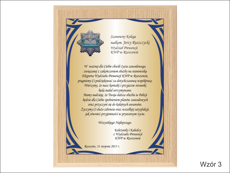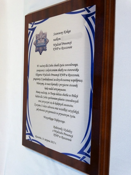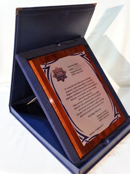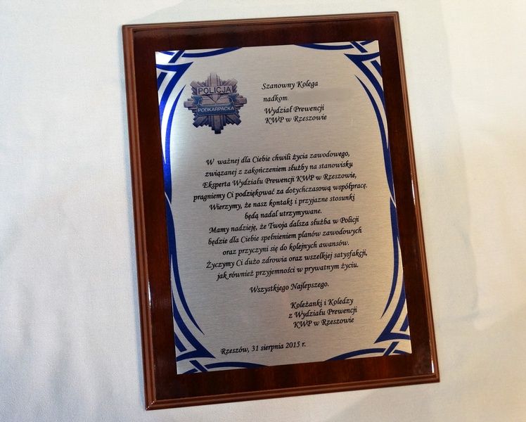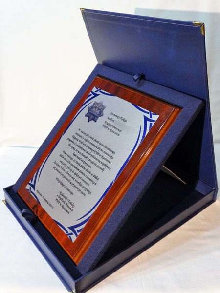 Dyplom drewniany z blachą z nadrukiem na standardowym podkładzie, na pamiątkę wspólnej służby.
