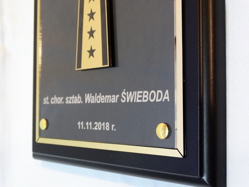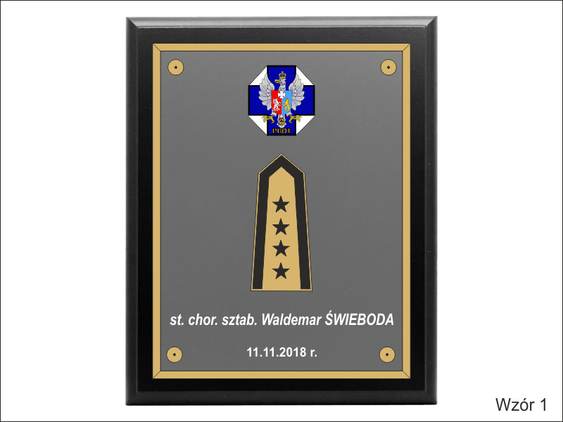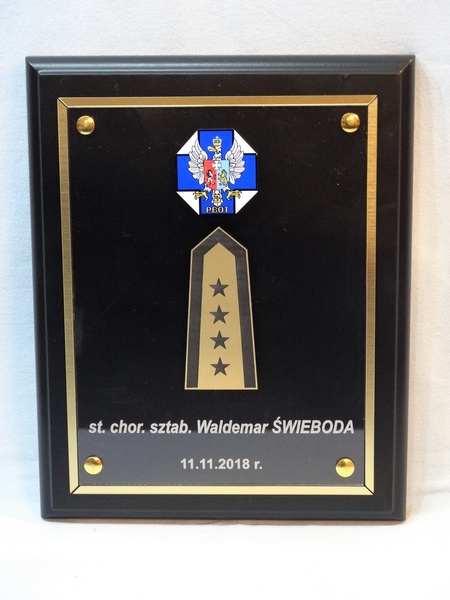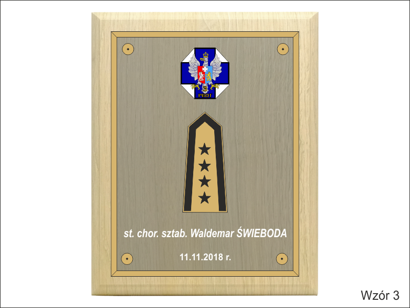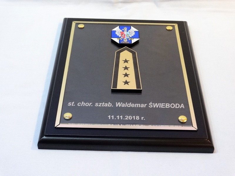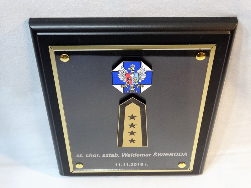 - z herbu / logotypu / odznaki / pagonu wyciętego i grawerowanego z laminatu lub nadrukowanego z blaszki
