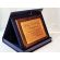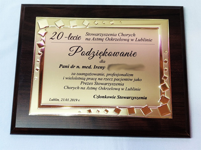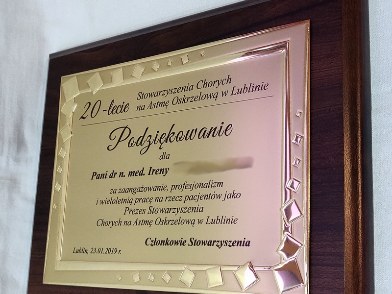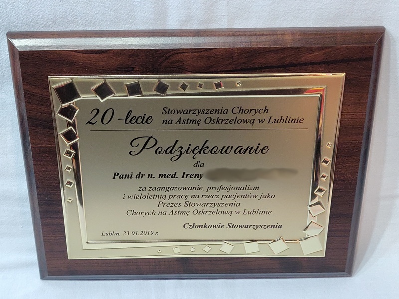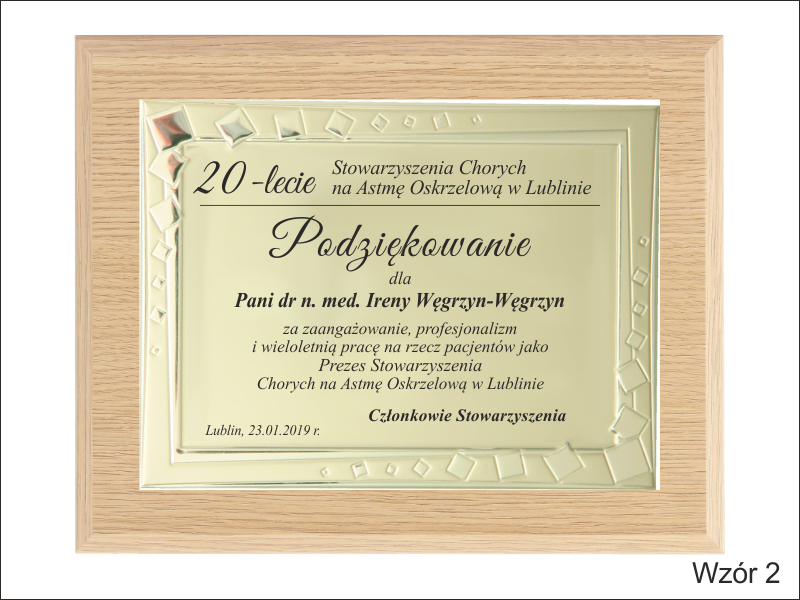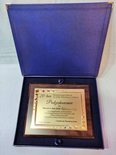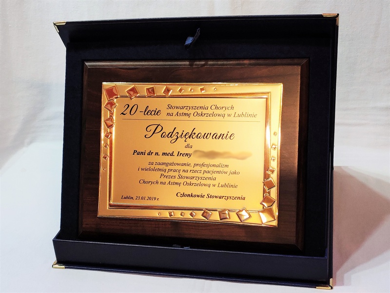Drewniany dyplom okolicznościowy jako podziękowanie za zaangażowanie i pracę na standardowym podkładzie z złotą paterą z nadrukiem.