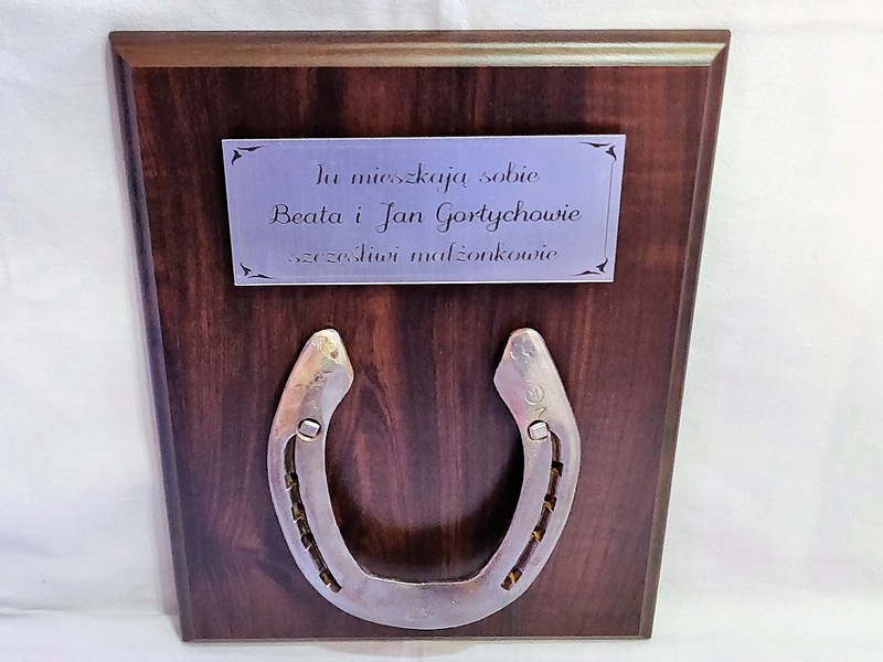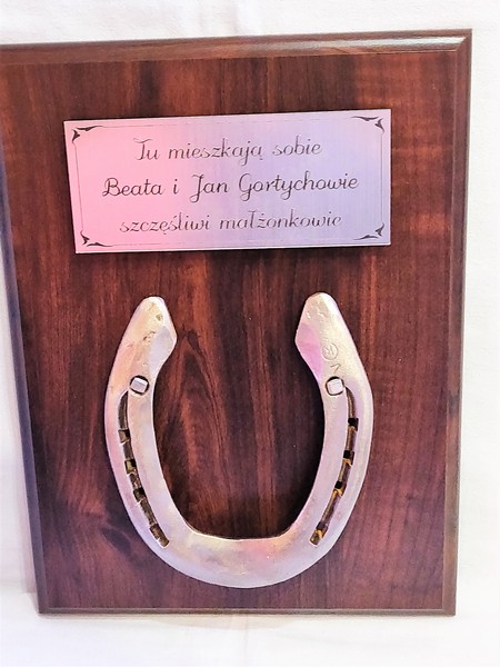 Pamiątkowy dyplom okolicznościowy na drewnianym podkładzie z podkową, jako prezentowy upominek składający się: