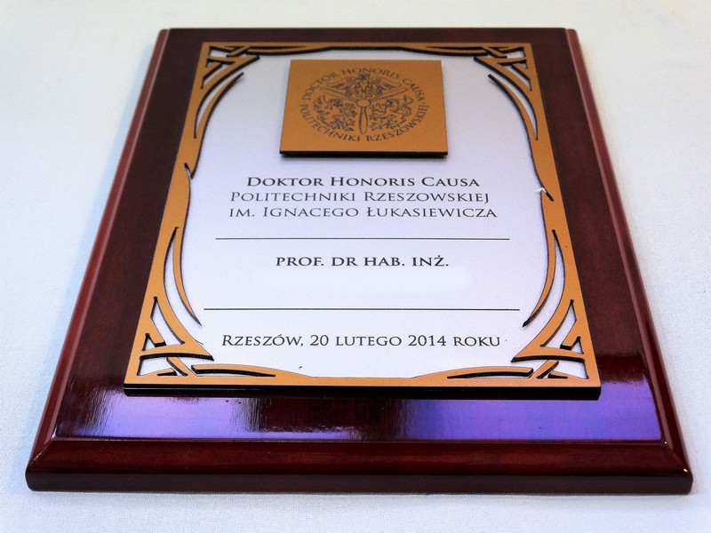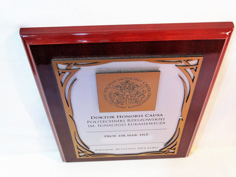 Złożony dyplom okolicznościowy na lakierowanym wiśniowym drewnianym podkładzie, składający się:
