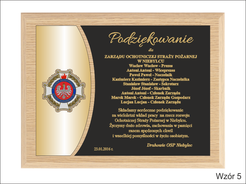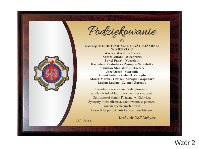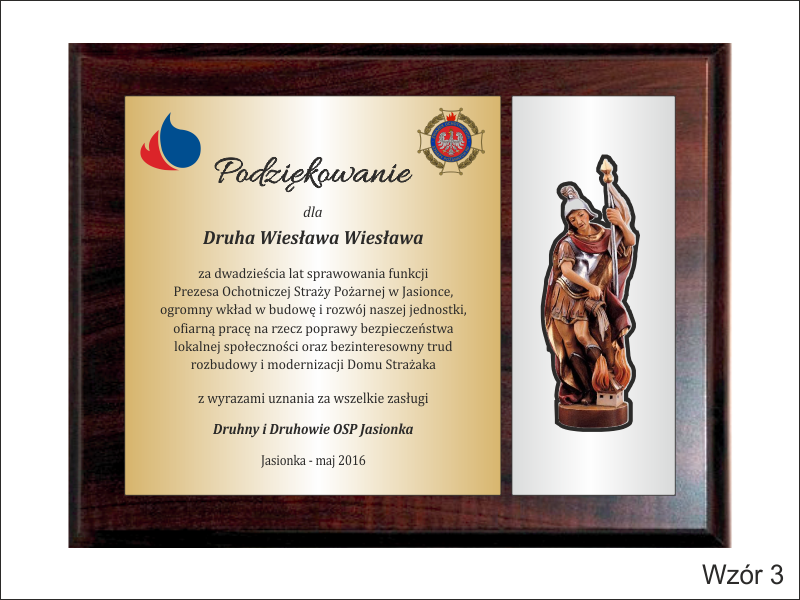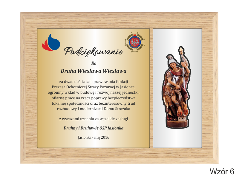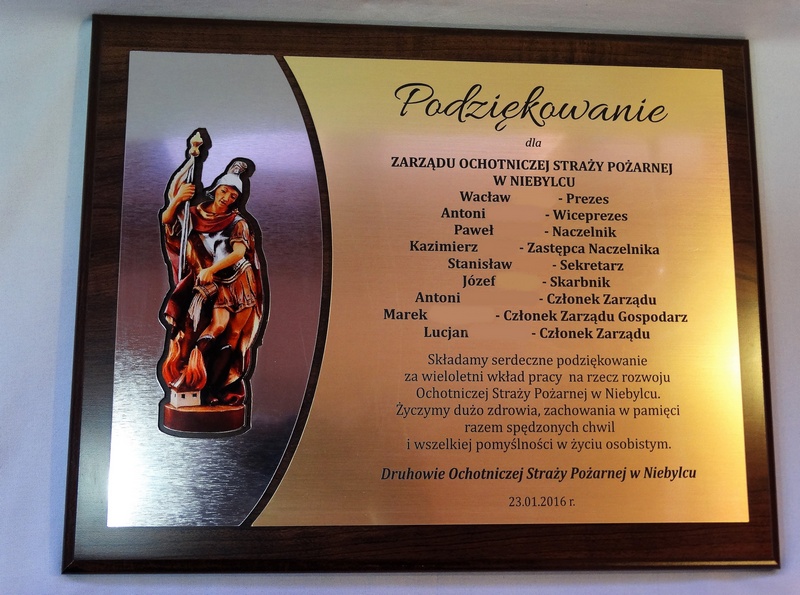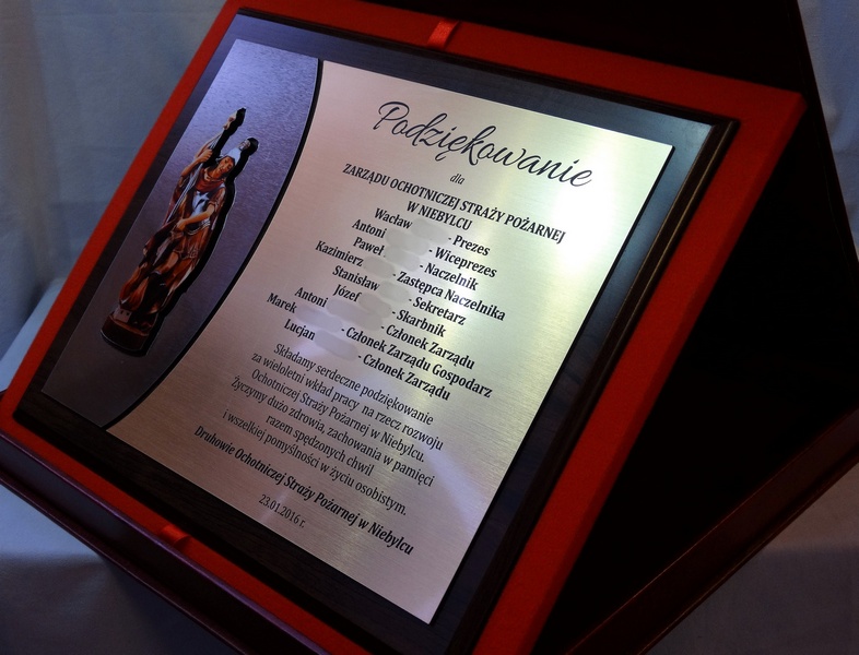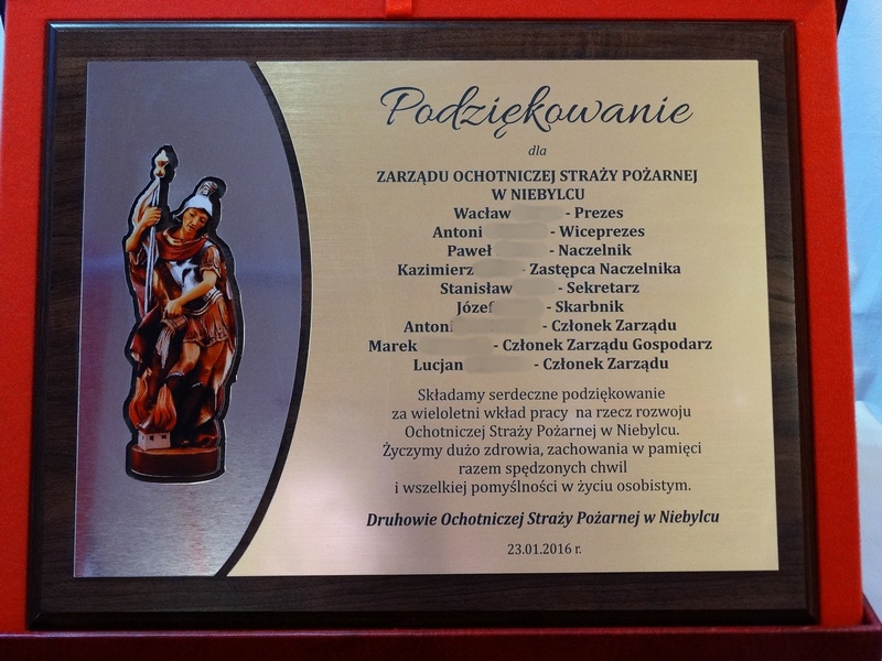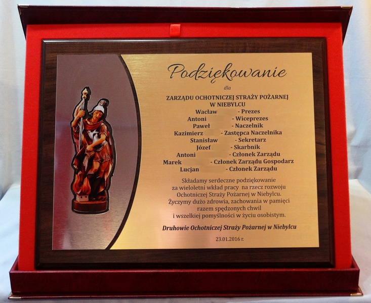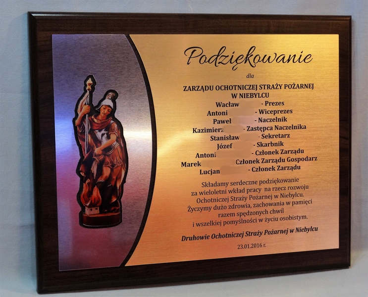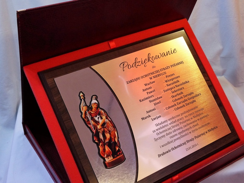 Dyplom pamiątkowy w złożonej formie na drewnianym podkładzie, jako podziękowanie druhom - strażakom, składający się: