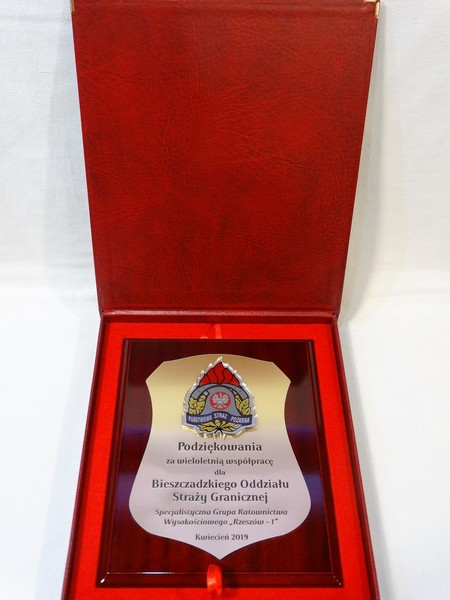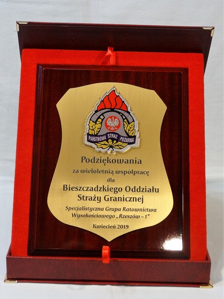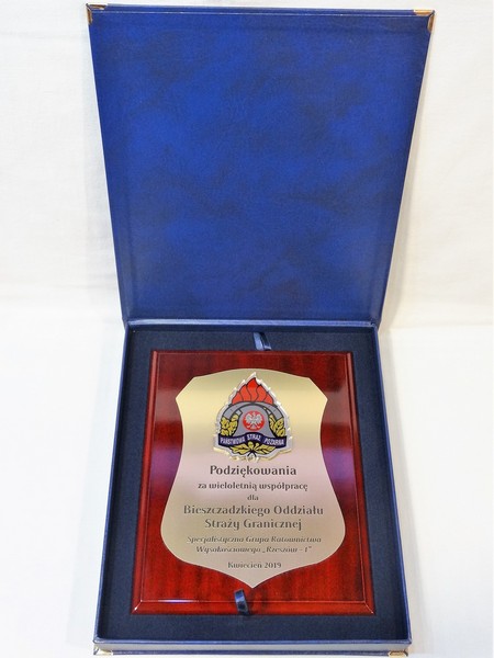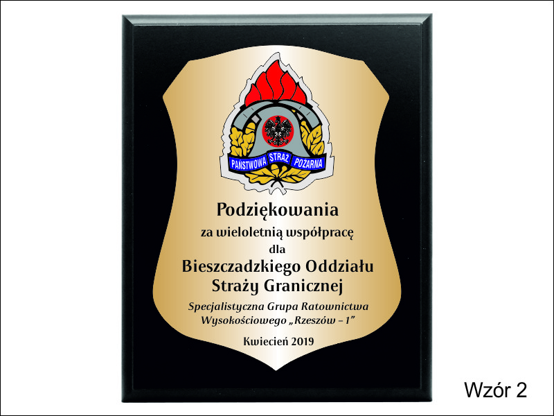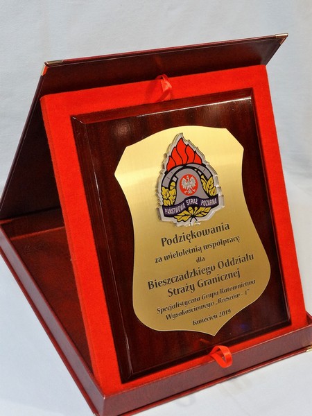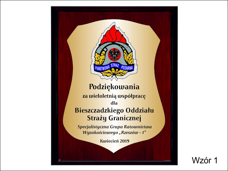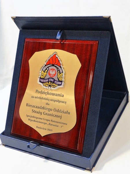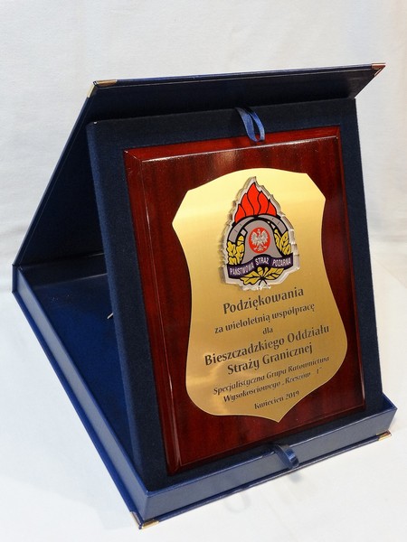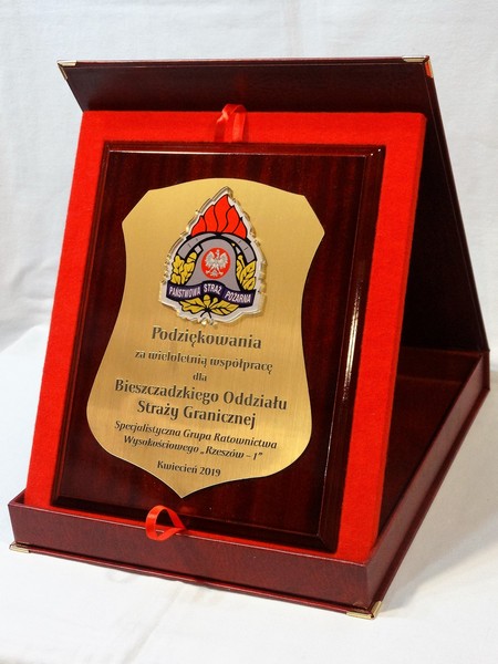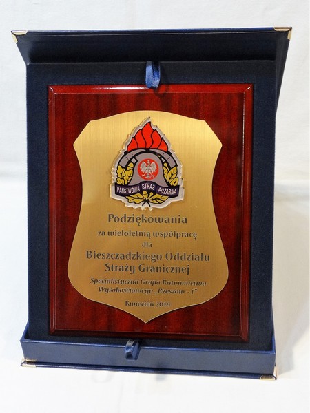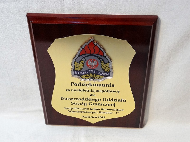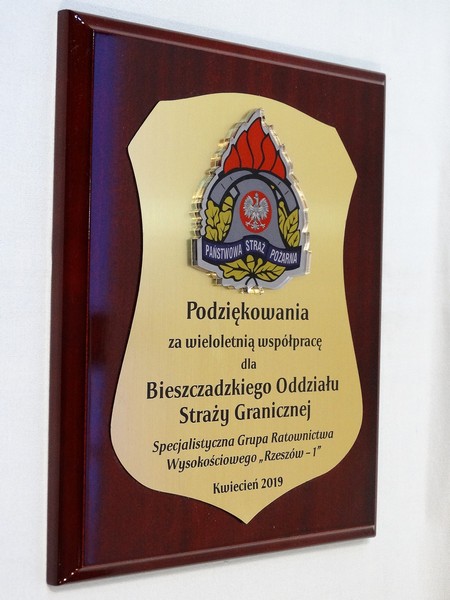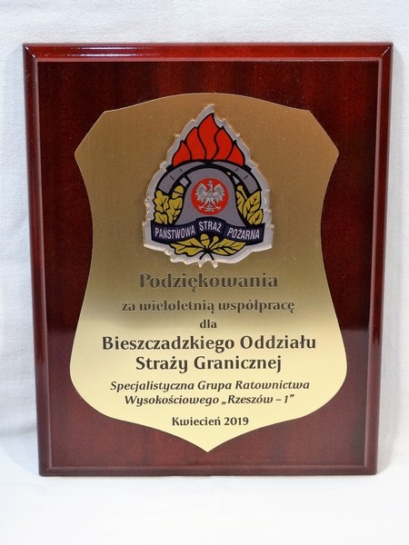 Dyplom okolicznościowy na drewnianym lakierowanym podkładzie jako podziękowanie od strażaków za współpracę.