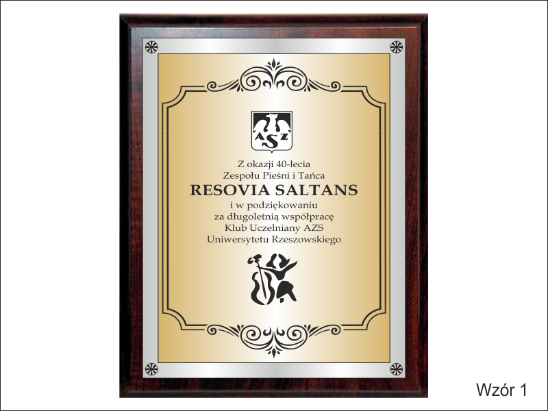 - z blaszki złotej z nadrukiem dedykacji oraz