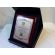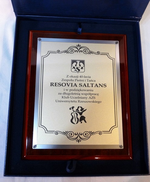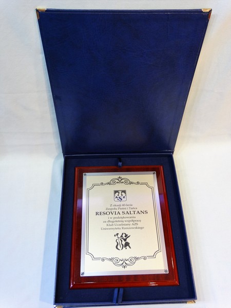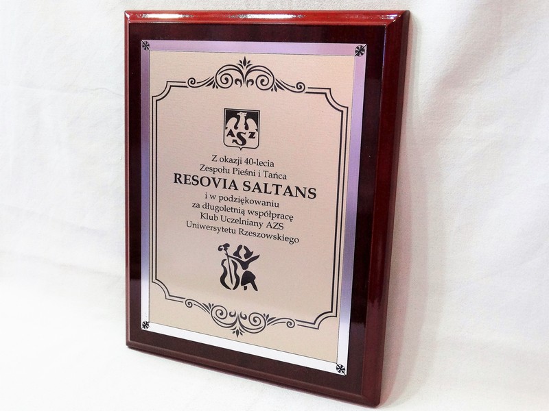 Złożony dyplom okolicznościowy na lakierowanym bordowym drewnianym podkładzie, składający się: