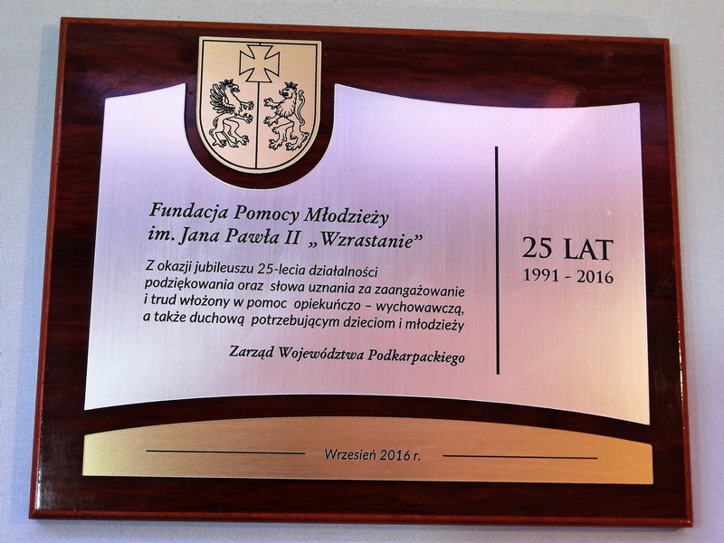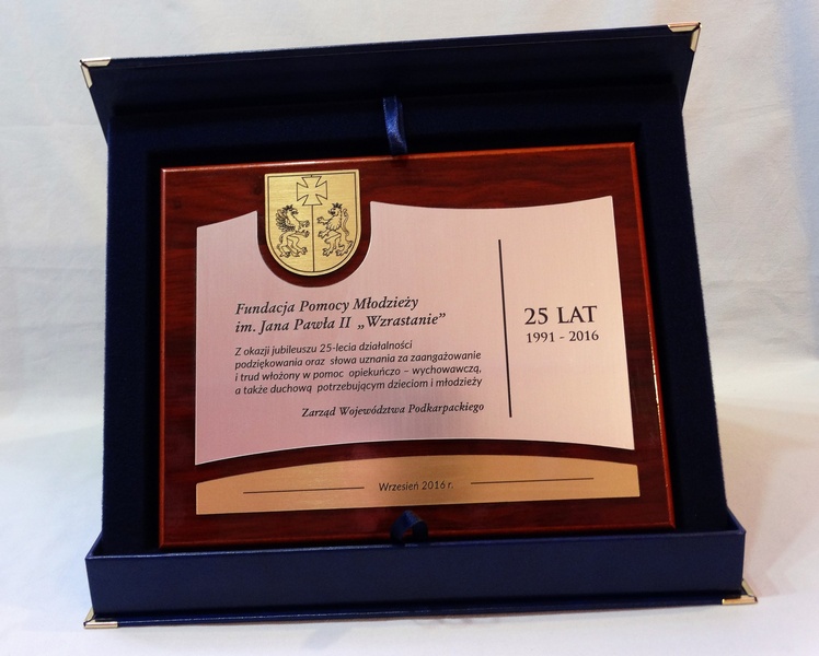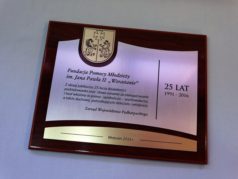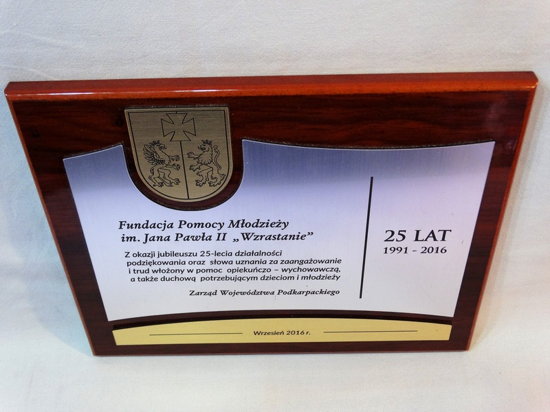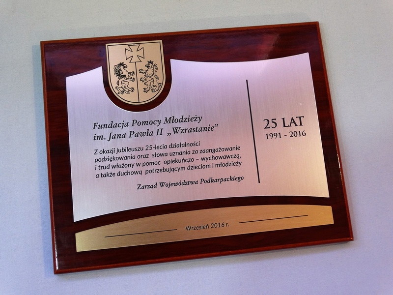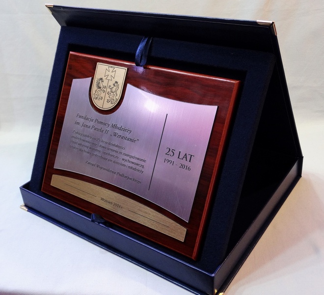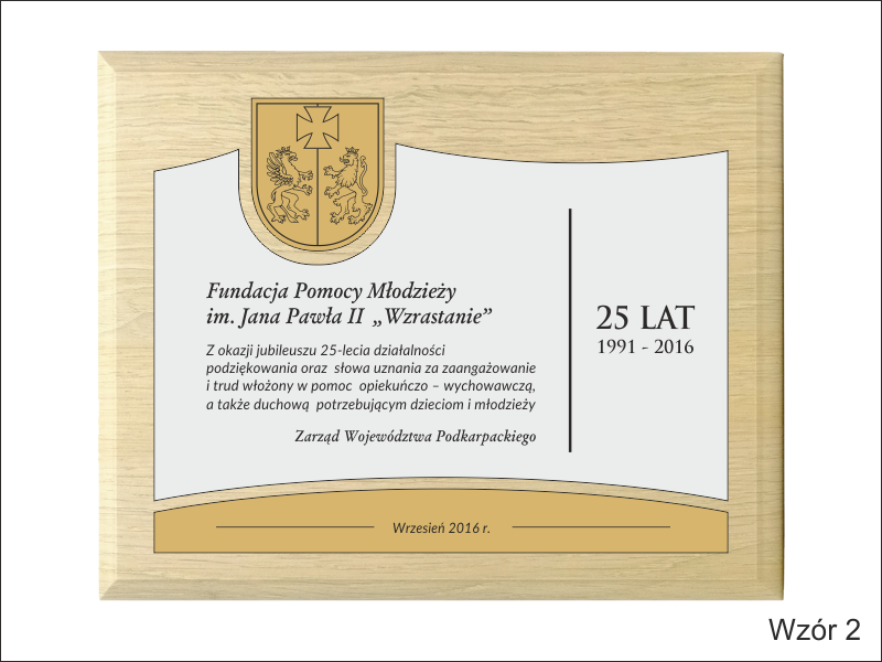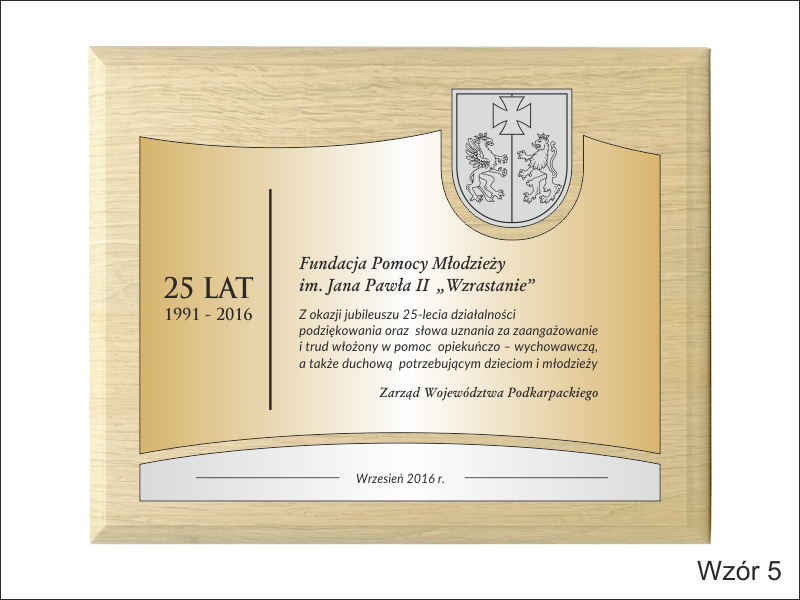 - z dopasowanych do siebie trzech rodzajów laminatów (srebrnego i złotego), z wygrawerowaną dedykacją, herbem, logiem
