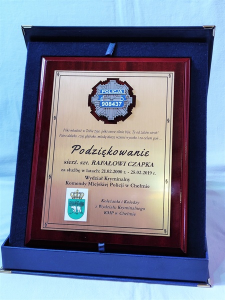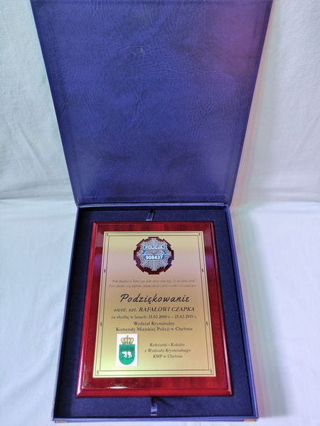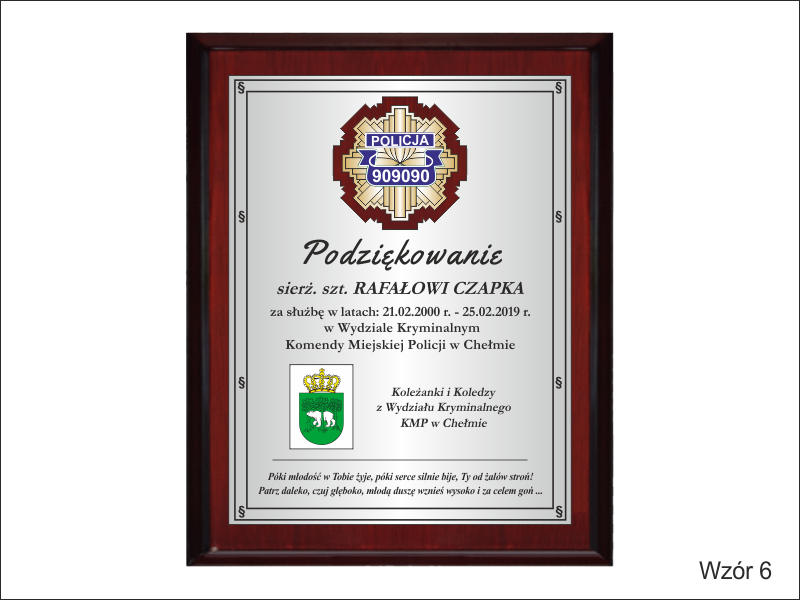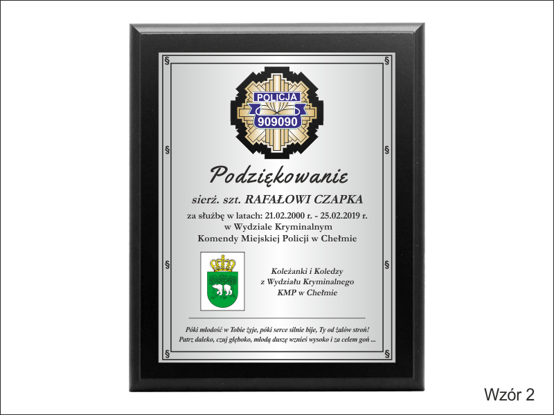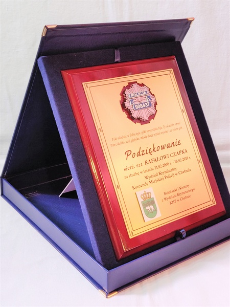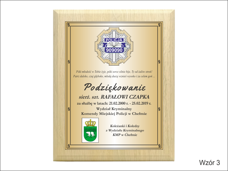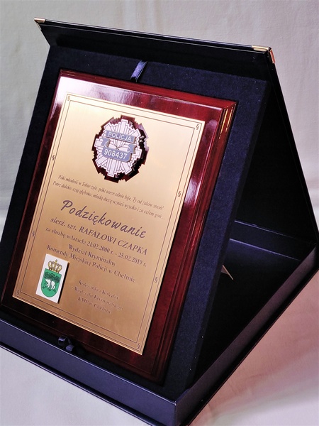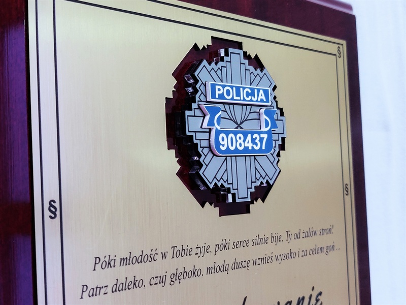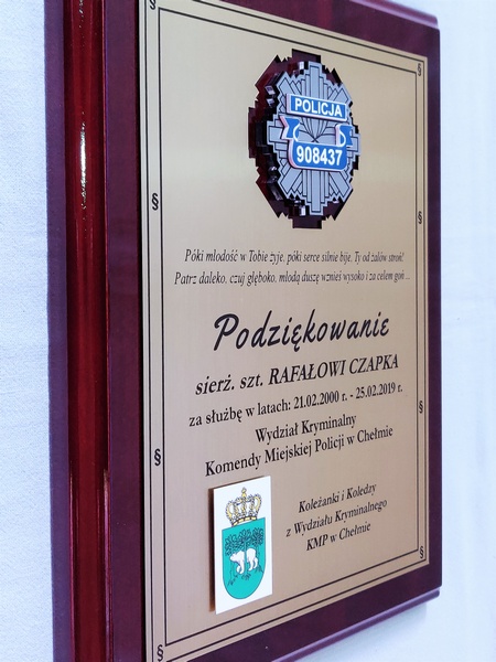 - z laminatu z wygrawerowaną dedykacją i wyciętym miejscem na odznakę,