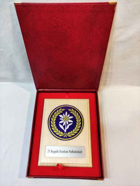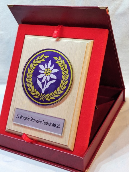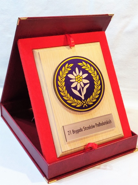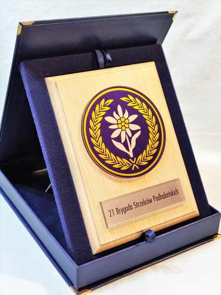 - z umieszczonej pod odznaką bezbarwnej pleksi z nadrukiem dedykacji,