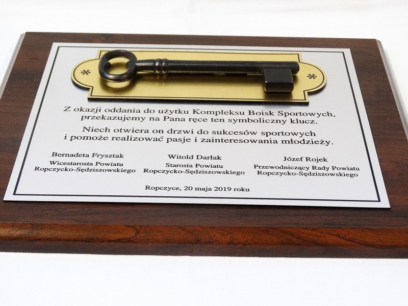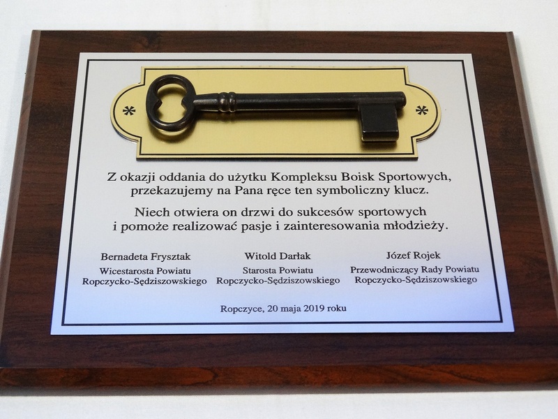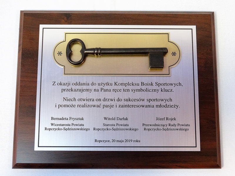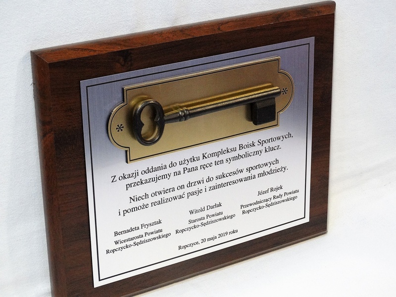 - z laminatów grawerskich (srebrnego, złotego, czarnego) z grawerowaną dedykacją,