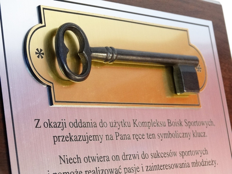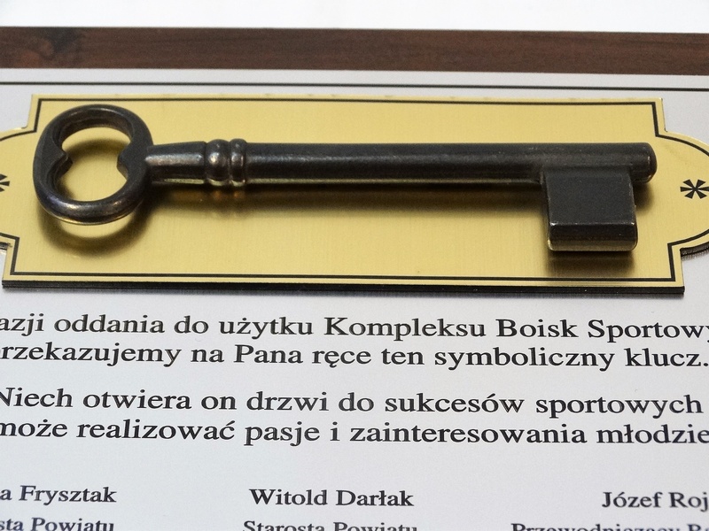 - z umocowanego na podkładce z laminatu klucza żeliwnego lub ozdobnej imitacji klucza wykonanej ze złotego laminatu