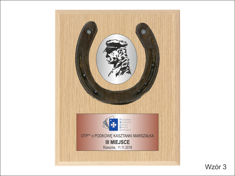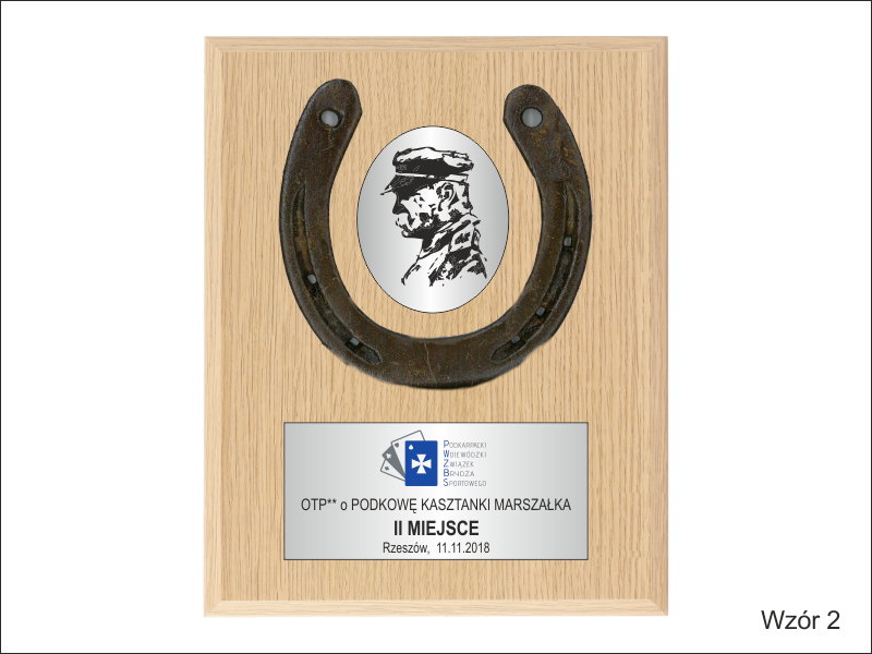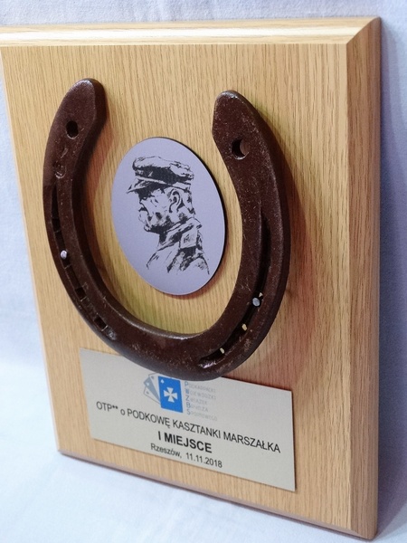 Złożony dyplom okolicznościowy na drewnianym podkładzie z podkową, jako nagroda w konkursie składający się: