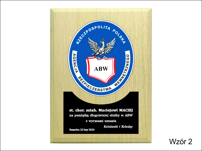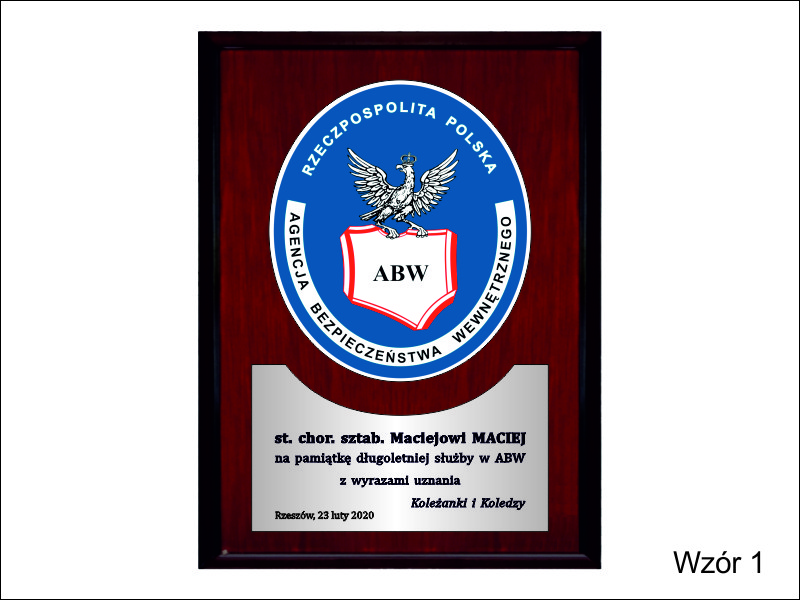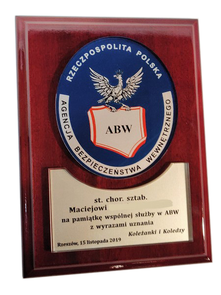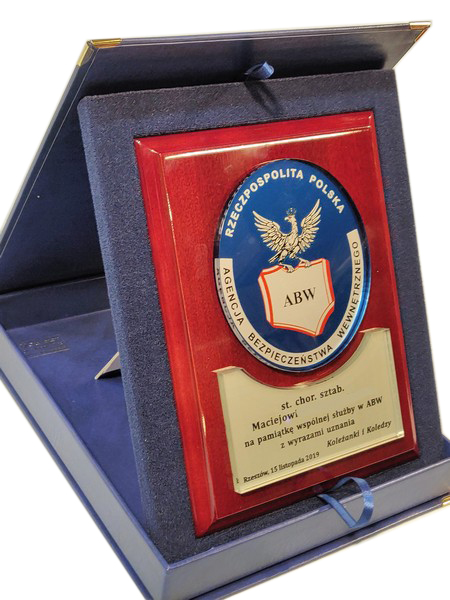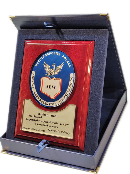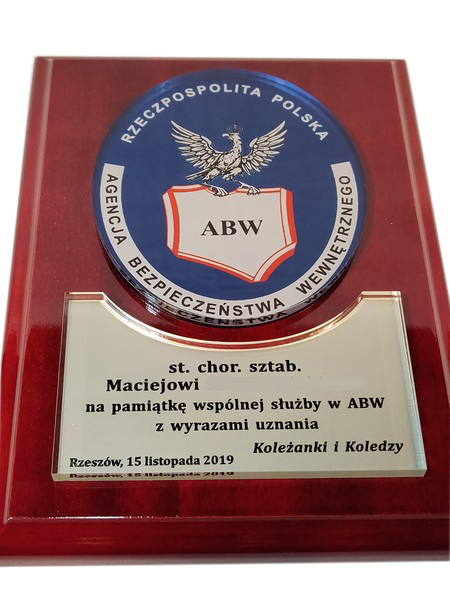 - z umieszczonej pod odznaką bezbarwnej pleksi z nadrukiem pamiątkowej dedykacji,
