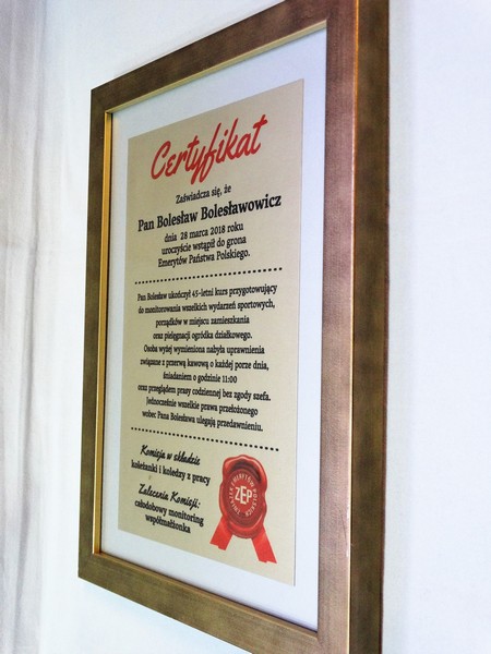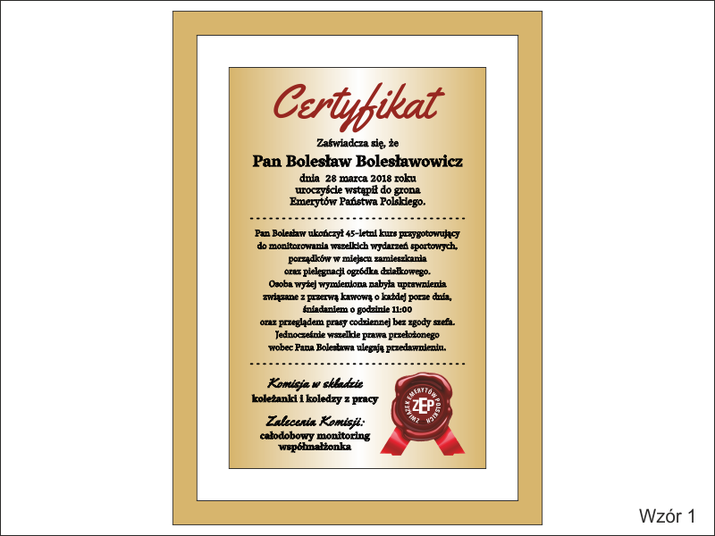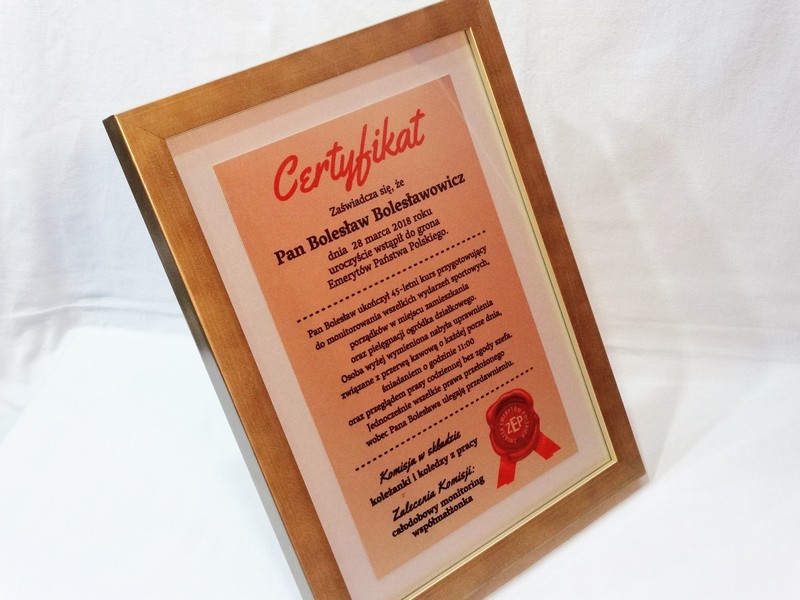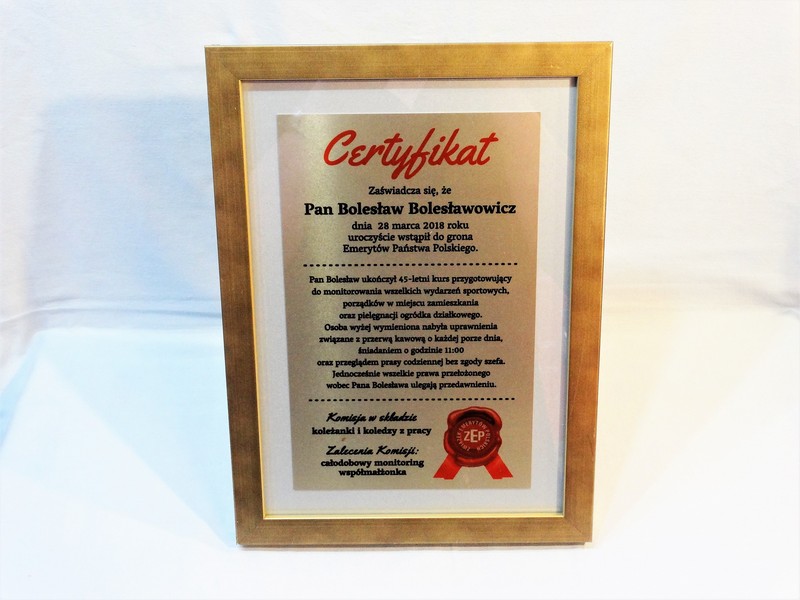 Prezentowany dyplom dedykowany jest jako certyfikat emeryta, ale można wykonać go też na inną okoliczność.