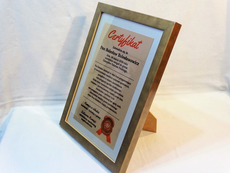 Dyplom w ramie za szkłem można zamówić w dwóch rozmiarach: A5 (20 x 15 cm) i A4 (21 x 30 cm).