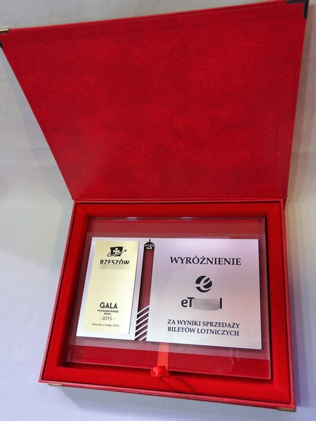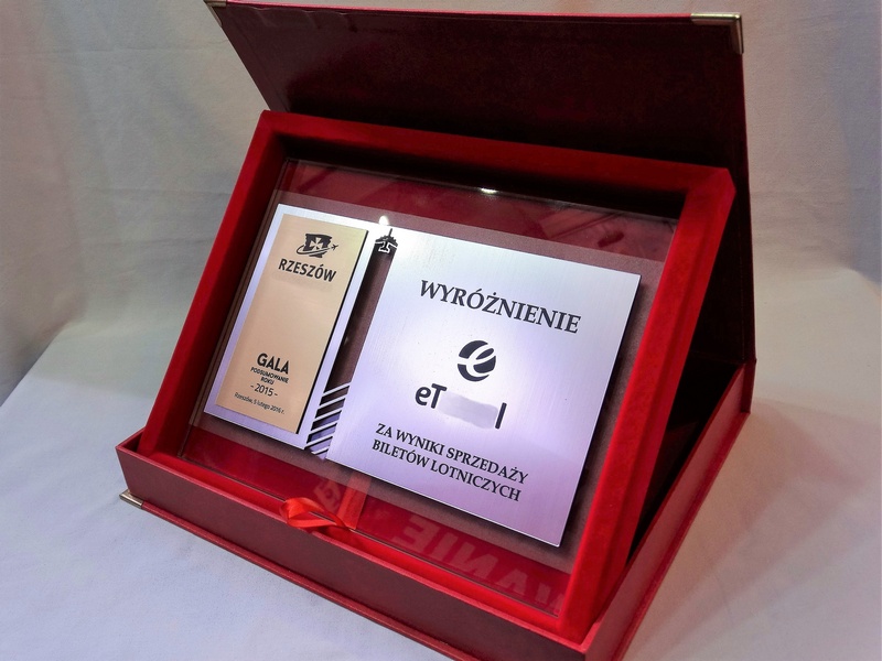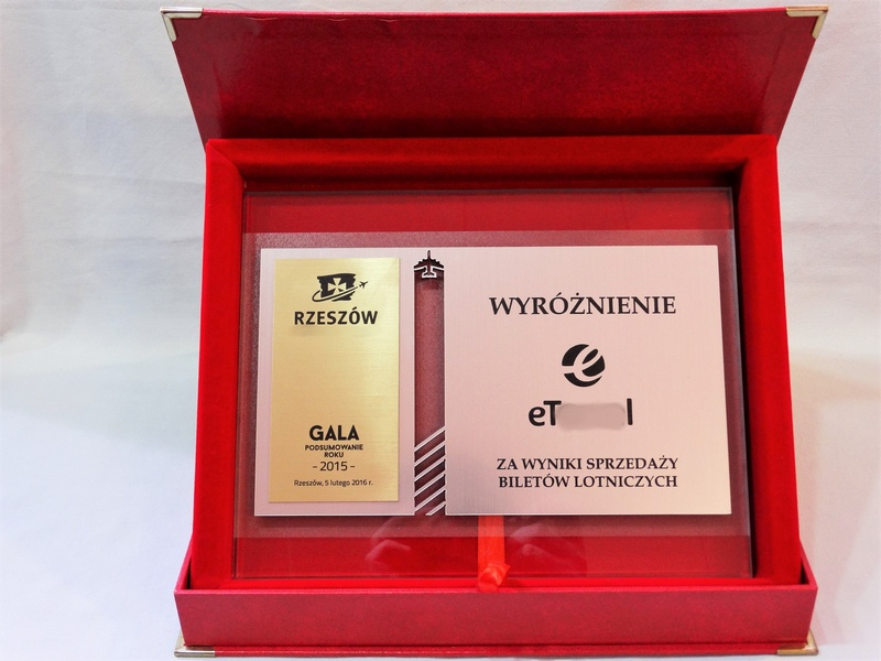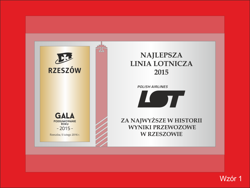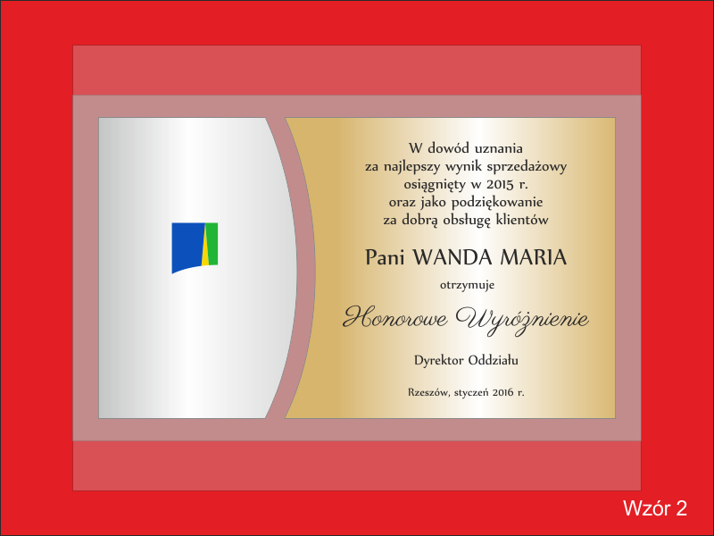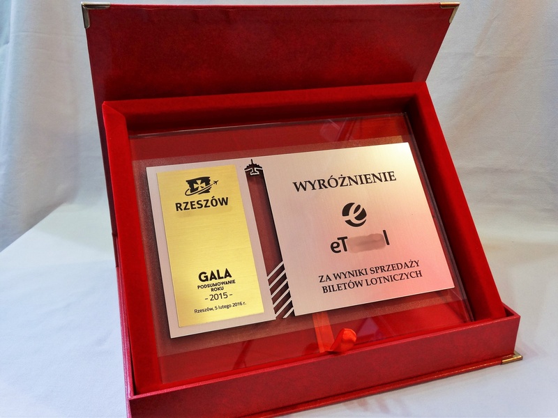 - z umieszczonych na szybie dopasowanych do siebie dwóch rodzajów laminatów - srebrnego i złotego - z wygrawerowaną dedykacją, grafikami i logotypami.