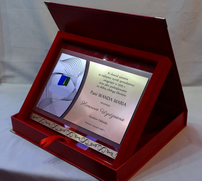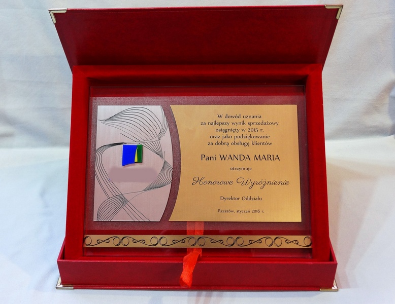 Szklany dyplom okolicznościowy jako nagroda / wyróżnienie w dedykowanym wyściełanym etui.