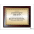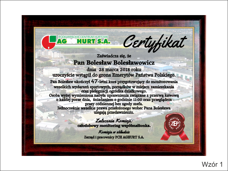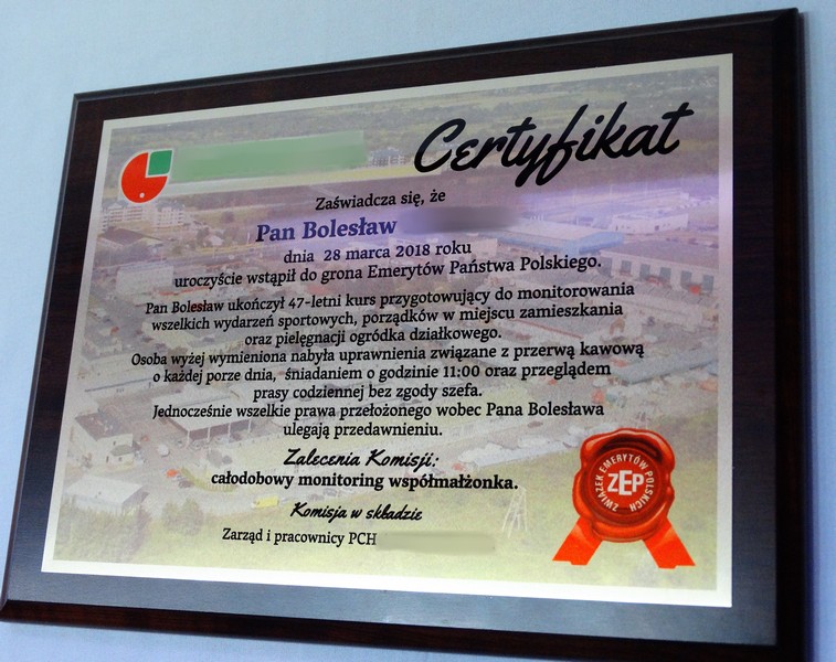 Certyfikat Emeryta w postaci dyplomu okolicznościowego na drewnianym podkładzie z blaszką z nadrukiem.