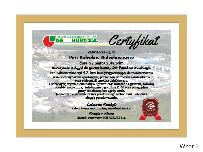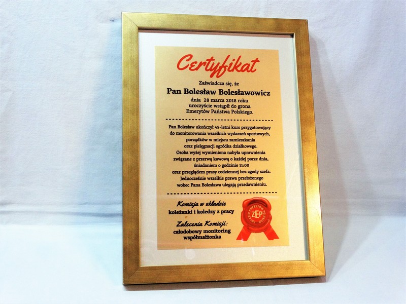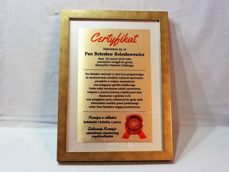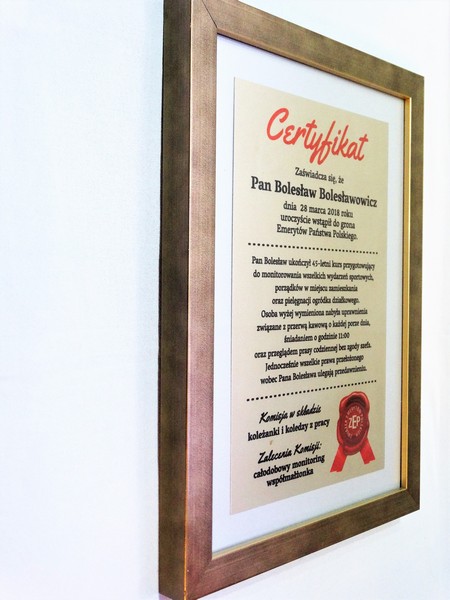 Certyfikat Emeryta w postaci dyplomu okolicznościowego w drewnianej ramie z blaszką z nadrukiem.