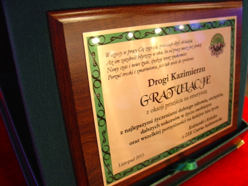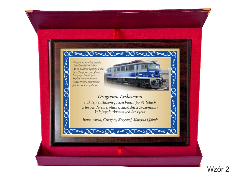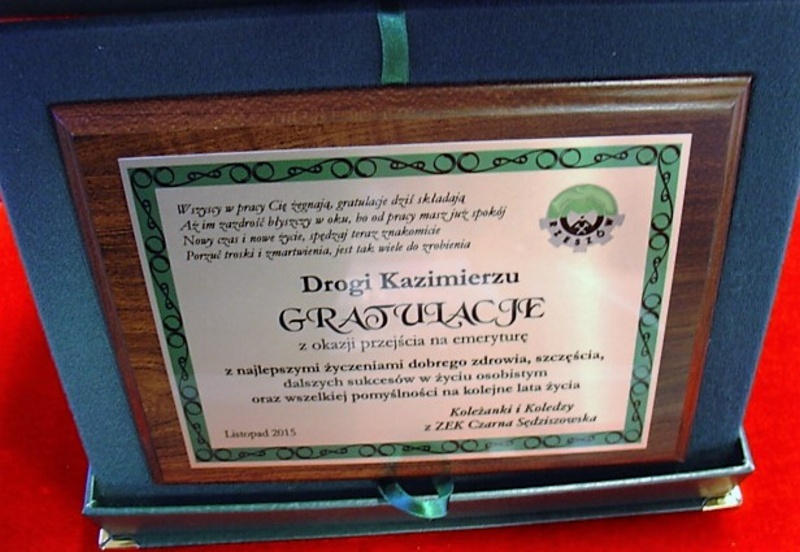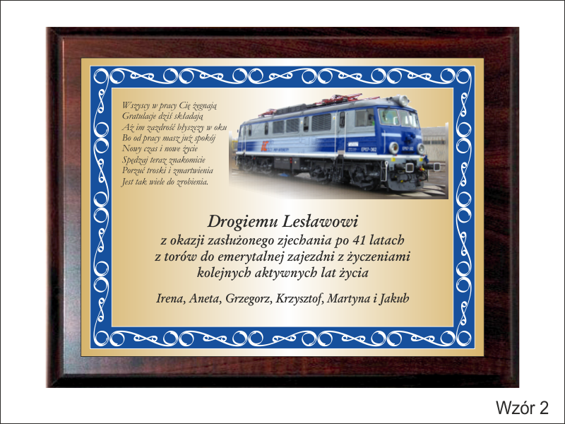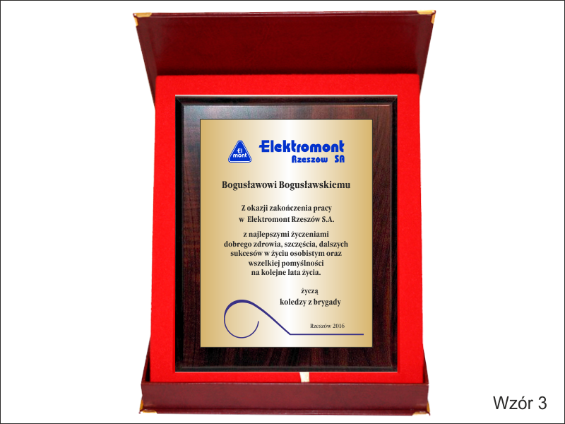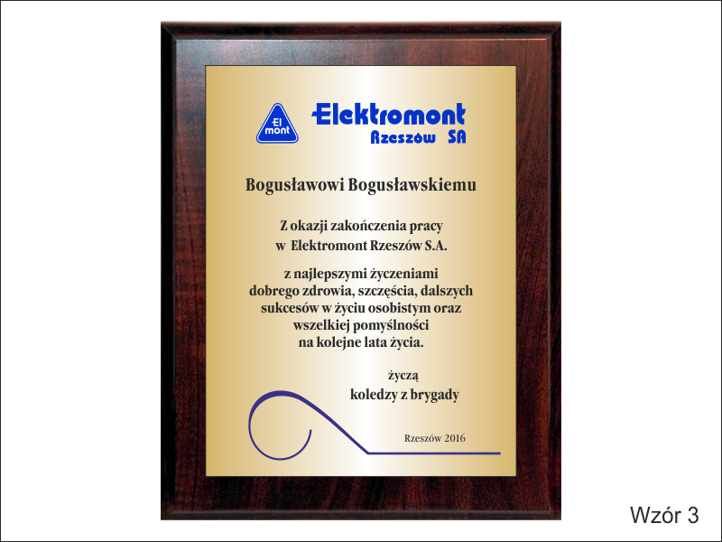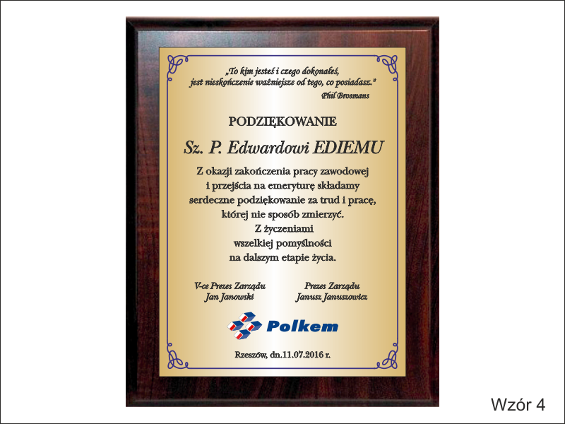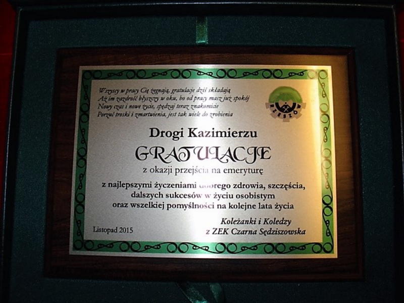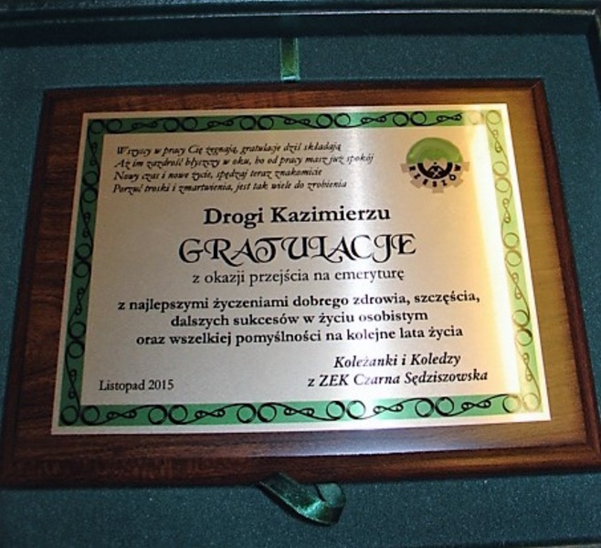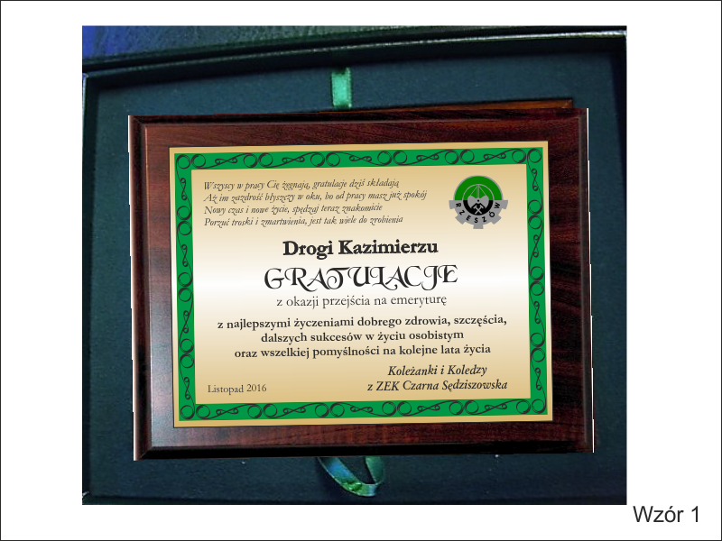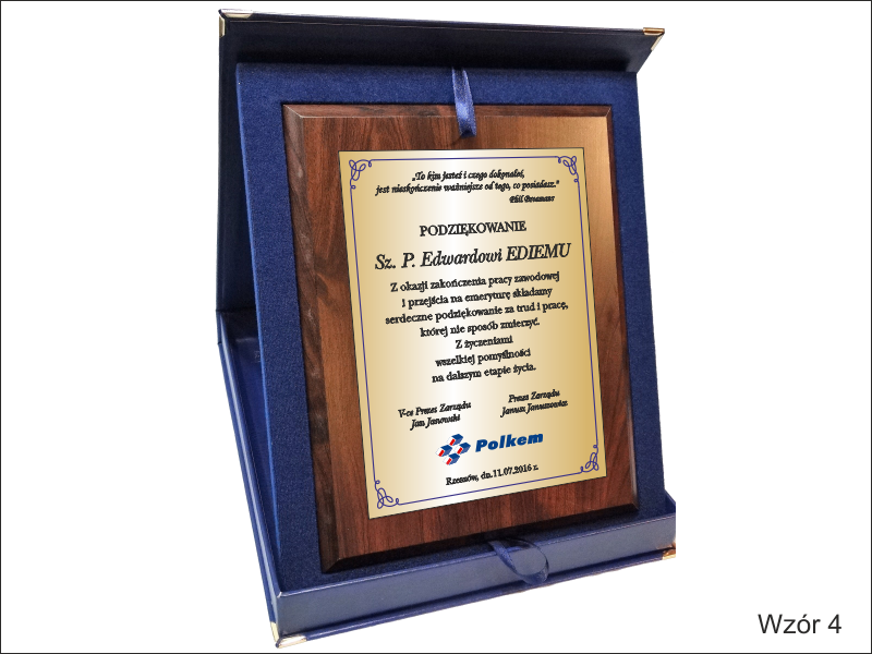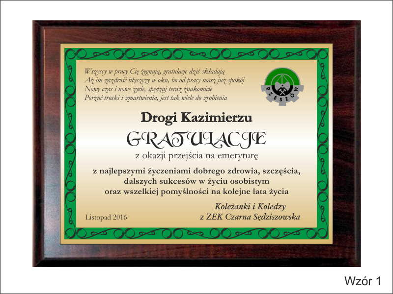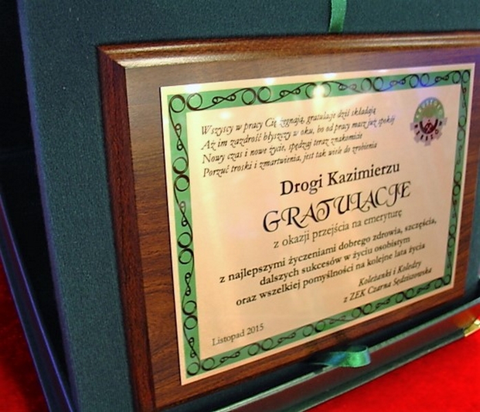 Gratulacje i Podziękowania z okazji przejścia na emeryturę w postaci dyplomu okolicznościowego na drewnianym podkładzie z blaszką z nadrukiem.