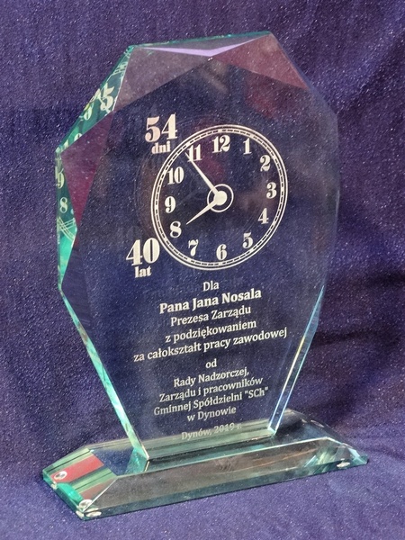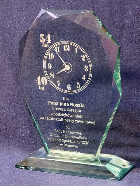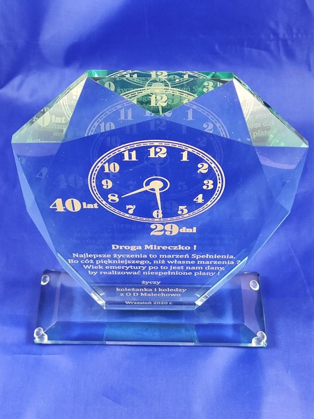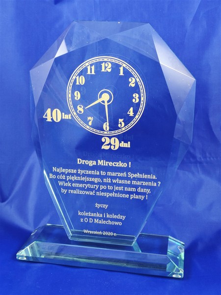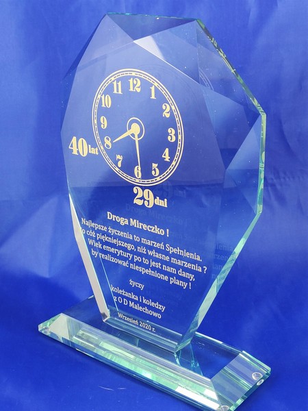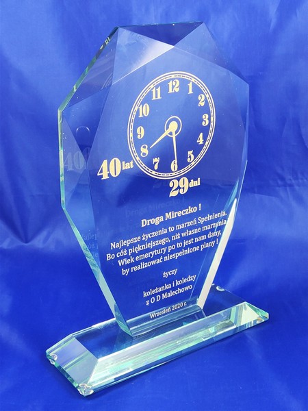 Okolicznościowy grawer z okazji emerytury można wykonać także na innych modelach statuetek szklanych.