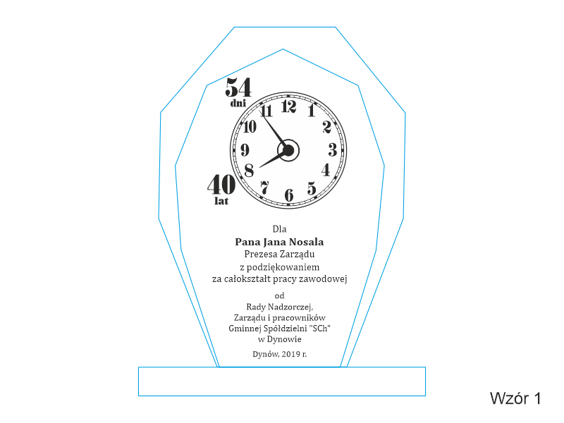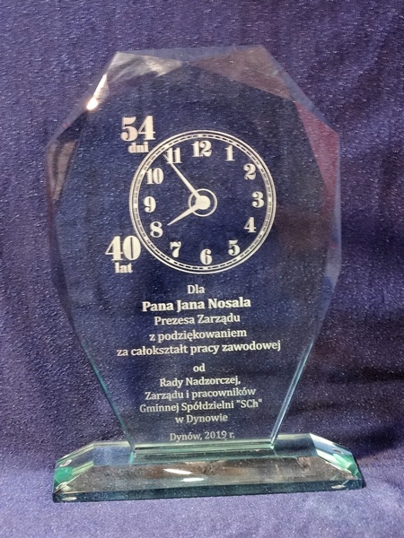 Na statuetce wykonany jest grawer okolicznościowej grafiki i dedykacji z podziękowaniem za wspólnie przepracowany czas.