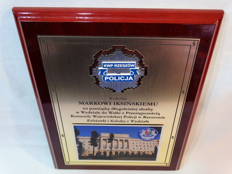 - wykonanej z laminatów i pleksy odznaki (herbu, loga)