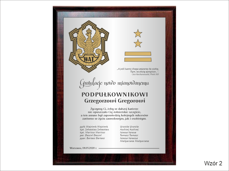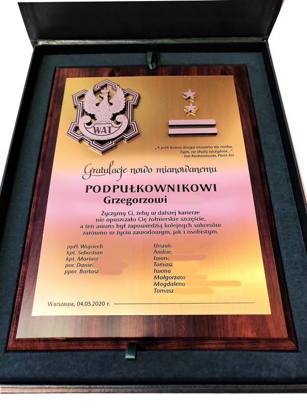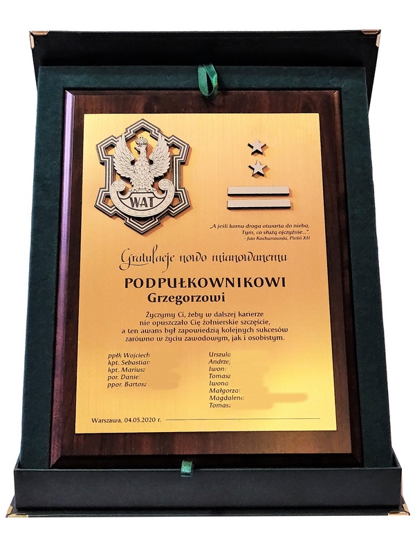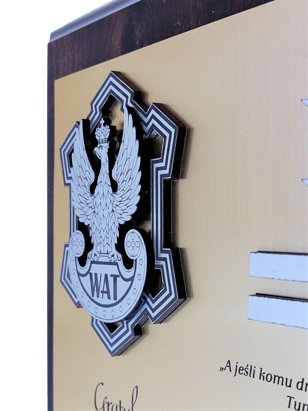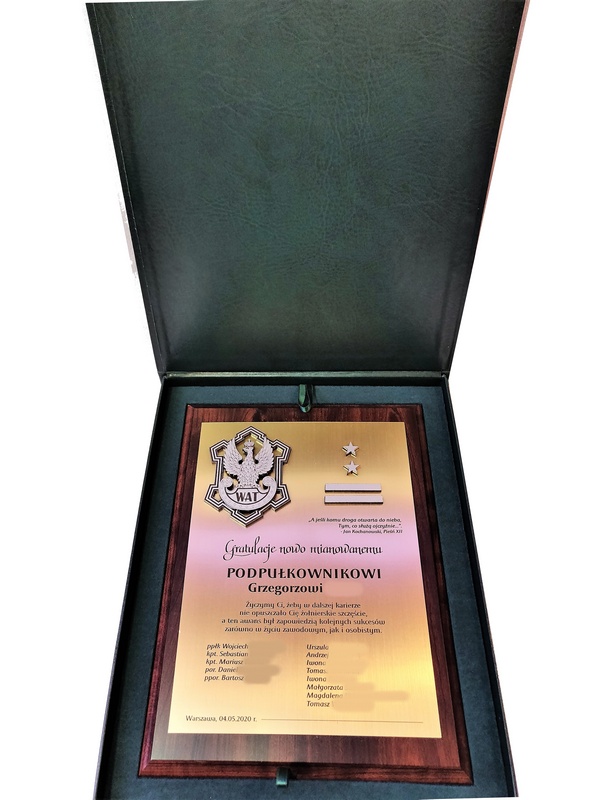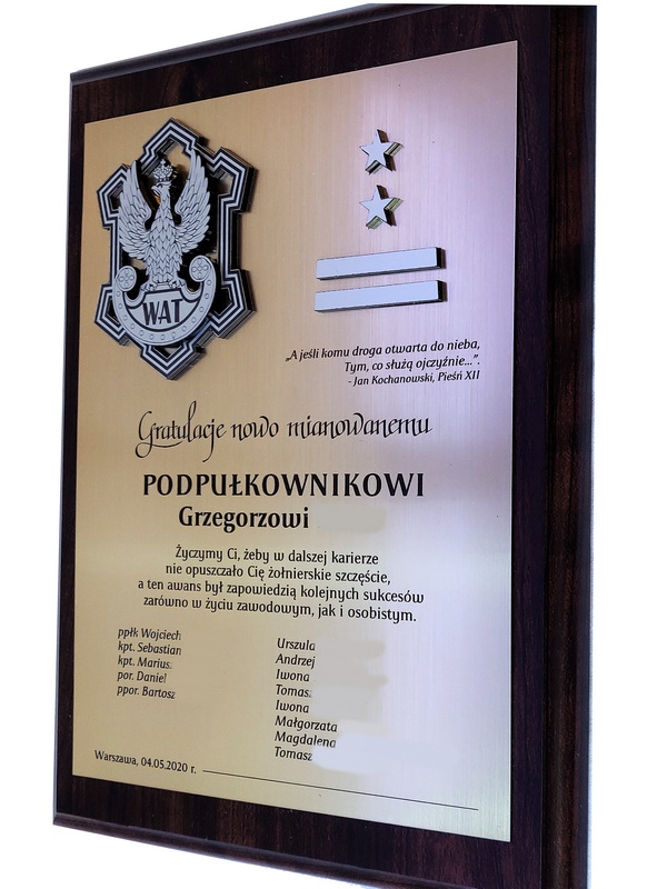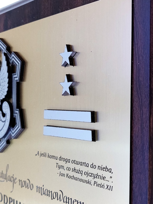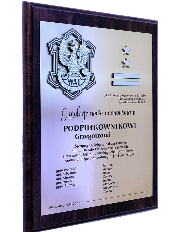 Gratulacje z okazji awansu na wyższy stopień w postaci ryngrafu drewnianego na standardowym podkładzie.