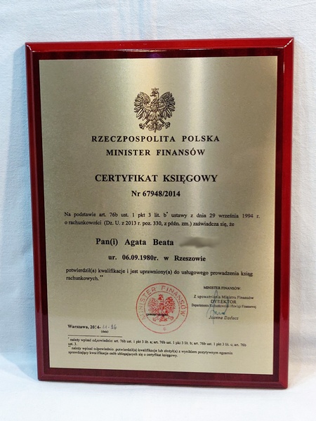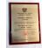 Certyfikat odtworzony jest wg oficjalnego wzoru na złotej blaszce umieszczonej na lakierowanym wiśniowym podkładzie.