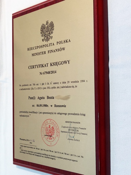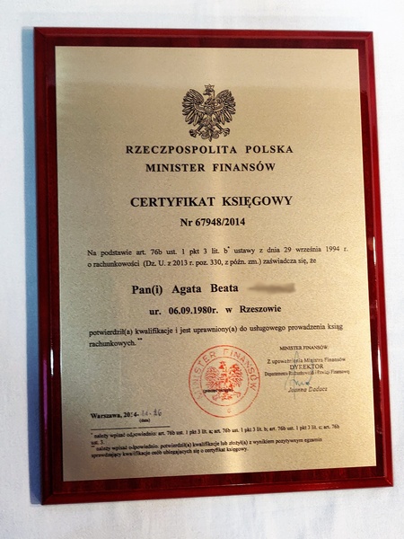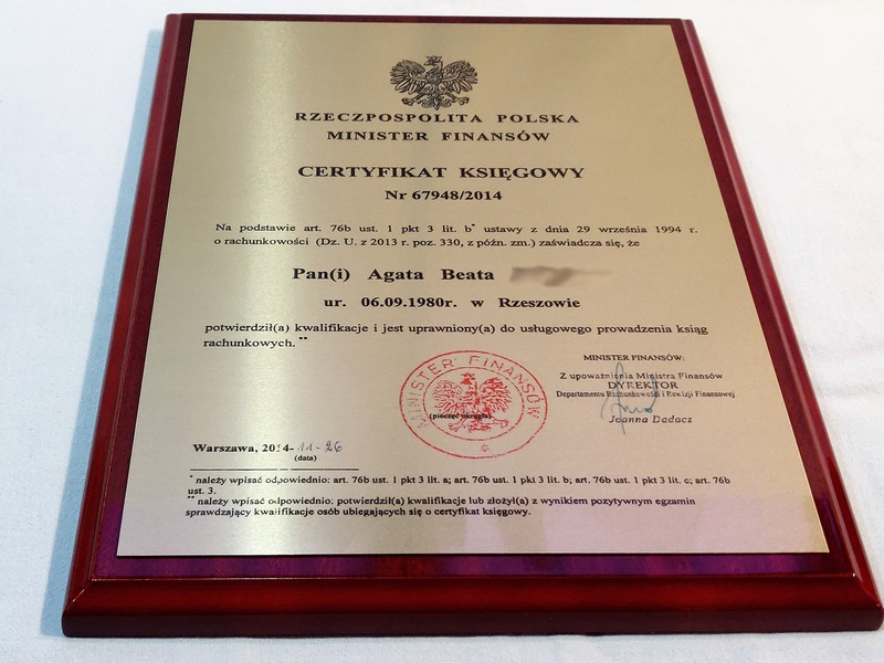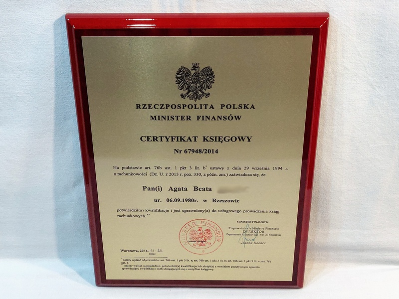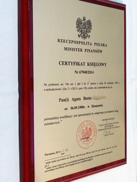 Certyfikat urzędowy potwierdzający uprawnienia w postaci dyplomu drewnianego na lakierowanym podkładzie.