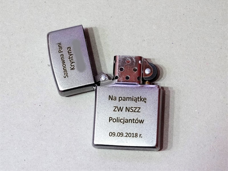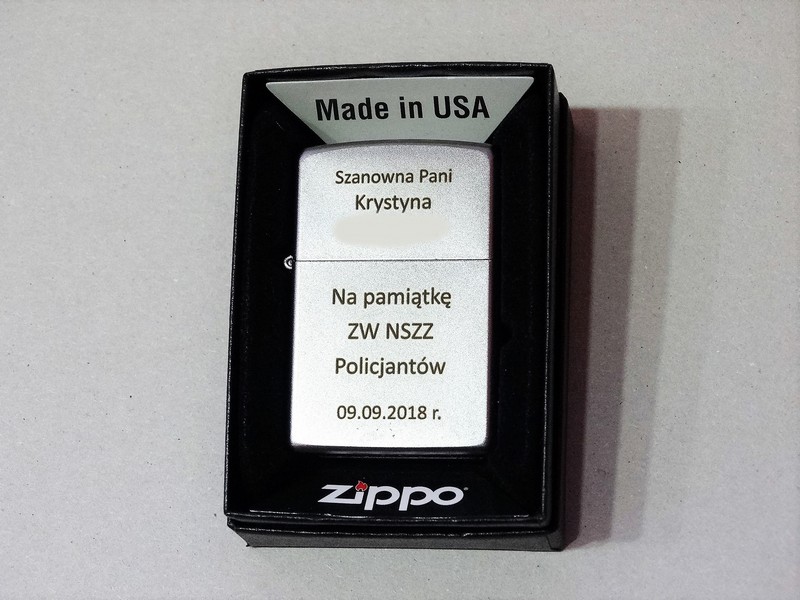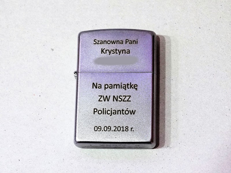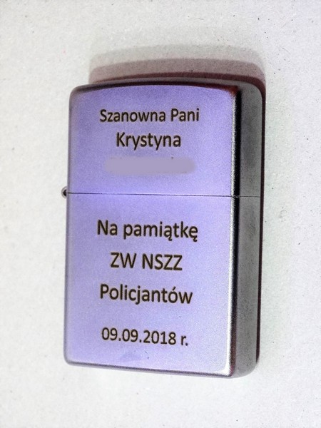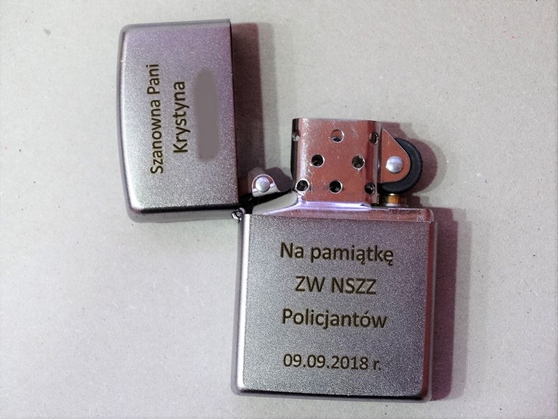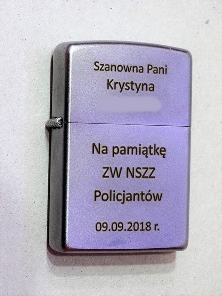 Na zapalniczce wykonany jest grawer okolicznościowej dedykacji z podziękowaniem za wspólną służbę.