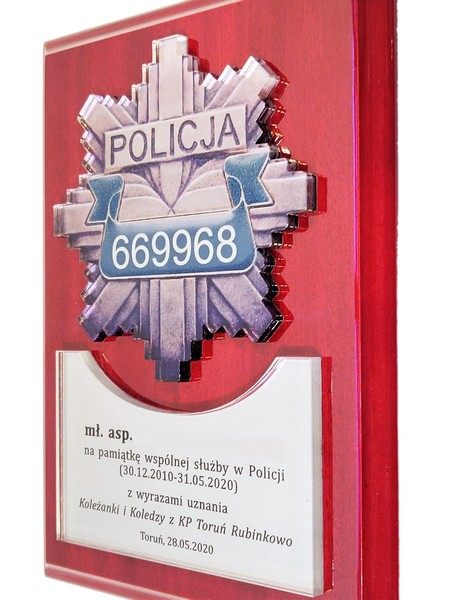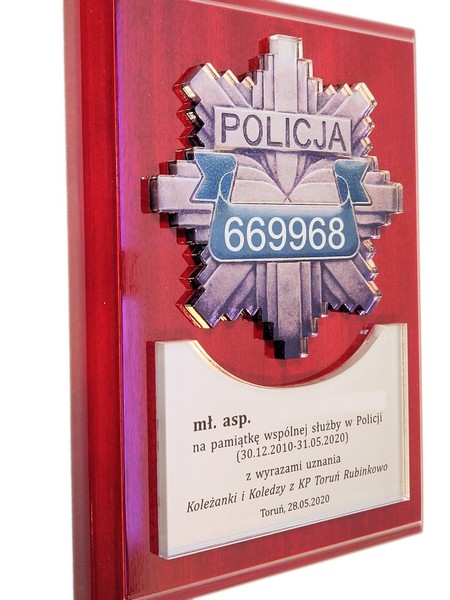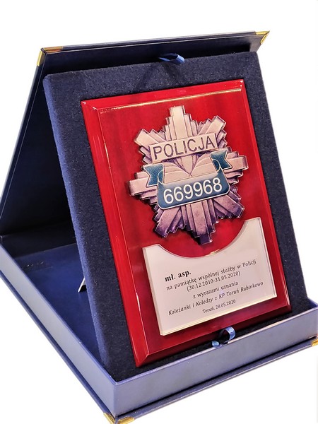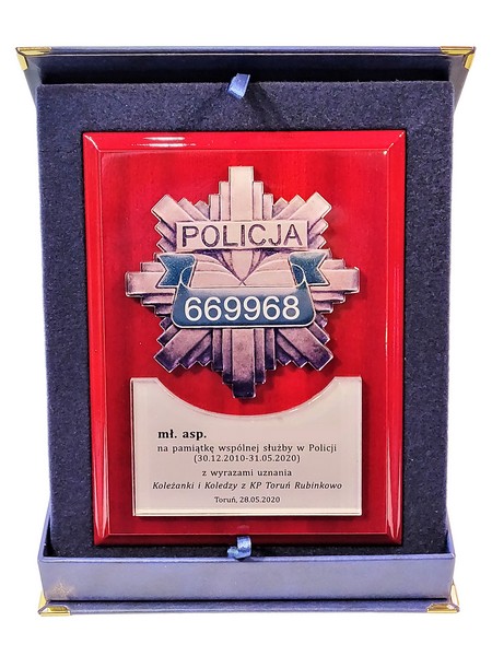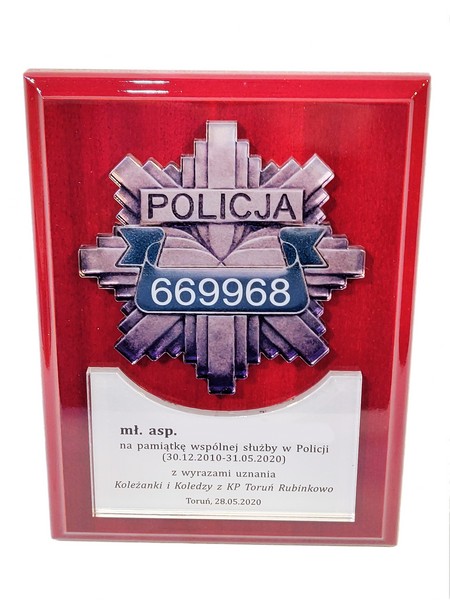 - z umieszczonej pod odznaką bezbarwnej pleksi z nadrukiem dedykacji na pamiątkę wspólnej służby,