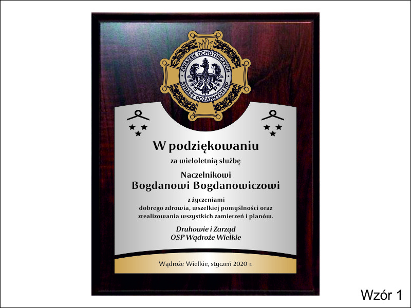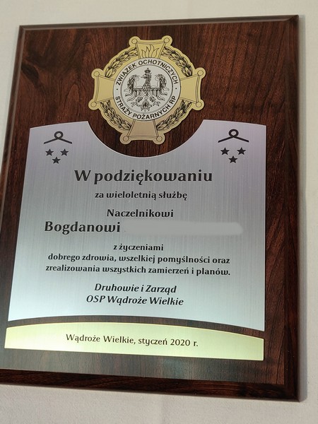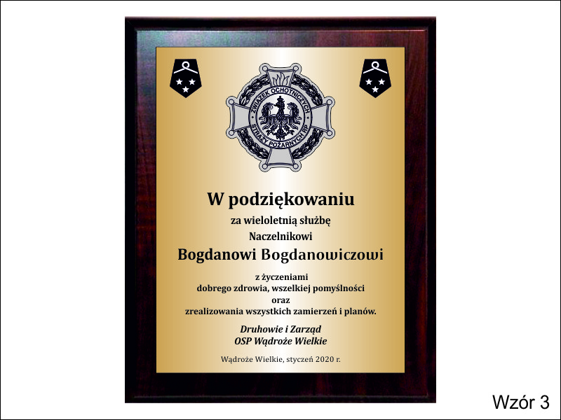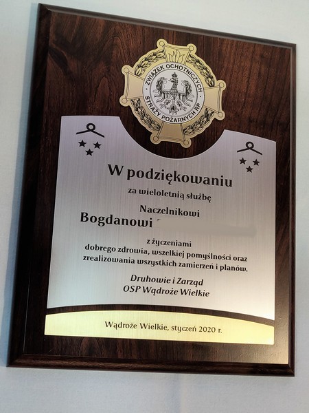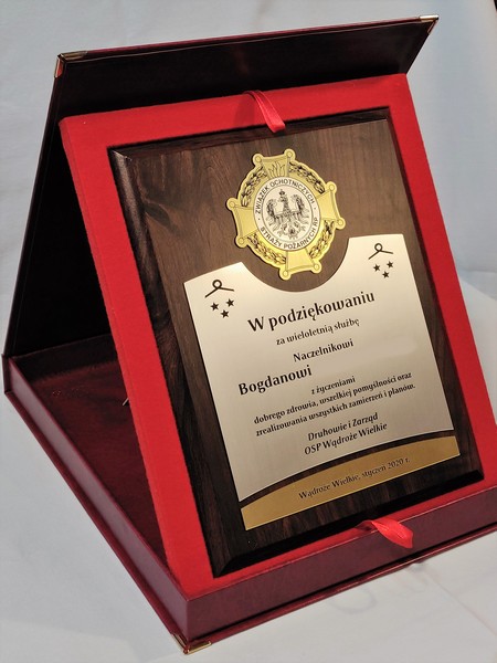 Podziękowanie z odznaką dla strażaka w formie drewnianego, grawerowanego dyplomu okolicznościowego.