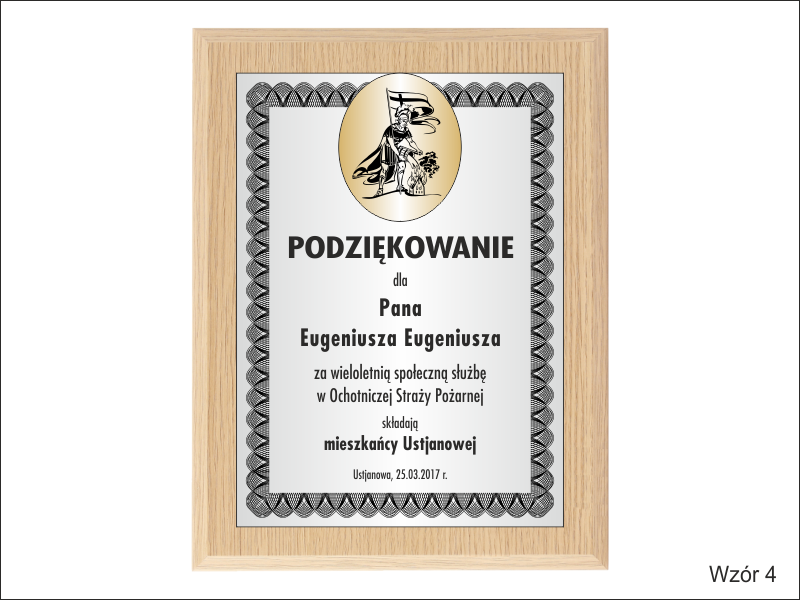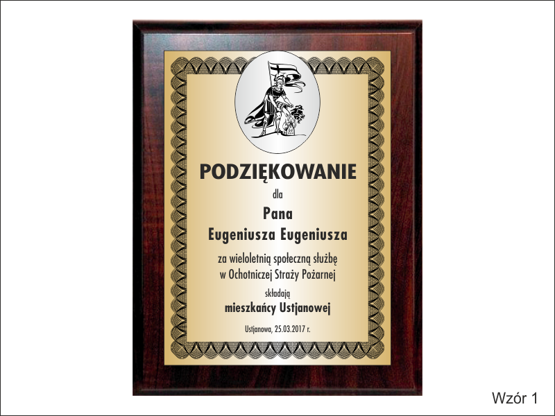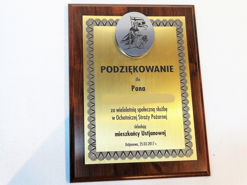 - z dodatkowej odznaki / herbu / loga wykonanej z grawerowanego laminatu czy blaszki umieszczonej na dodatkowej pleksi,