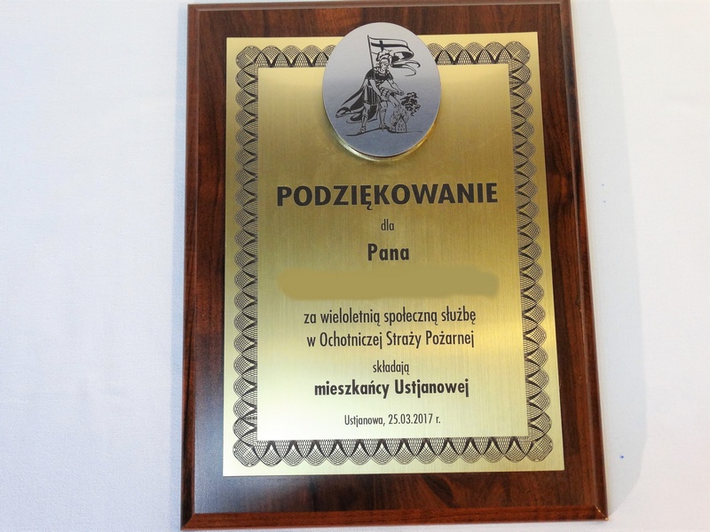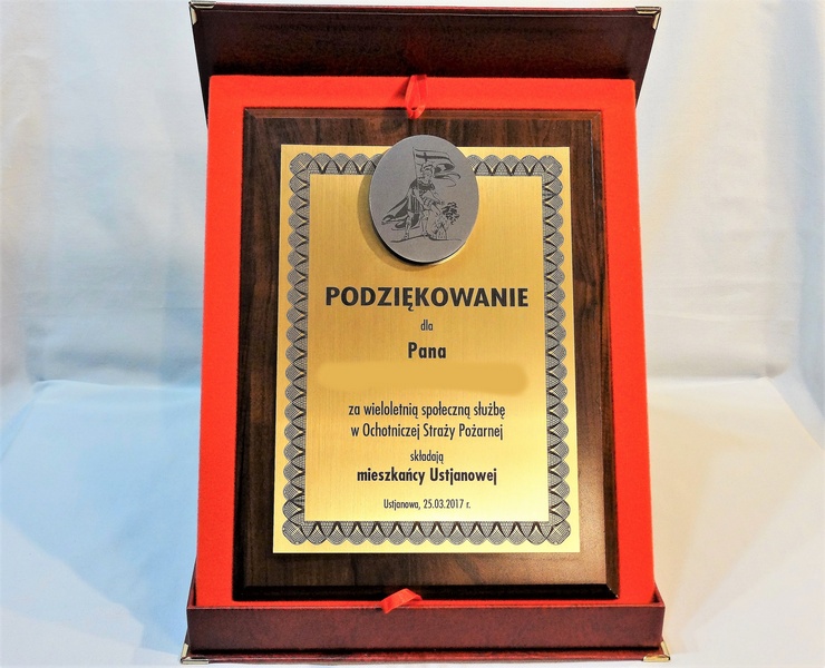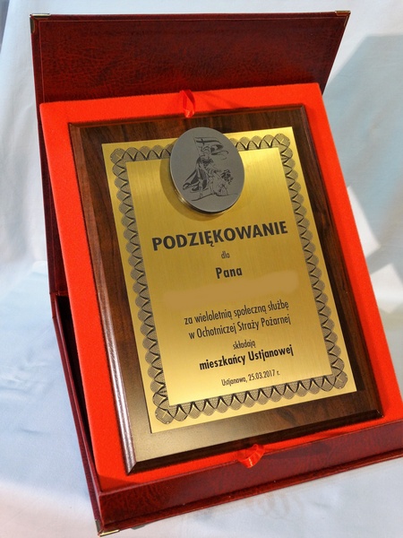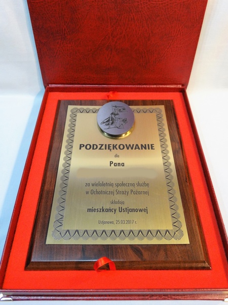Podziękowanie dla strażaka w postaci drewnianego dyplomu okolicznościowego w złożonej formie.