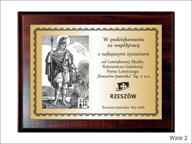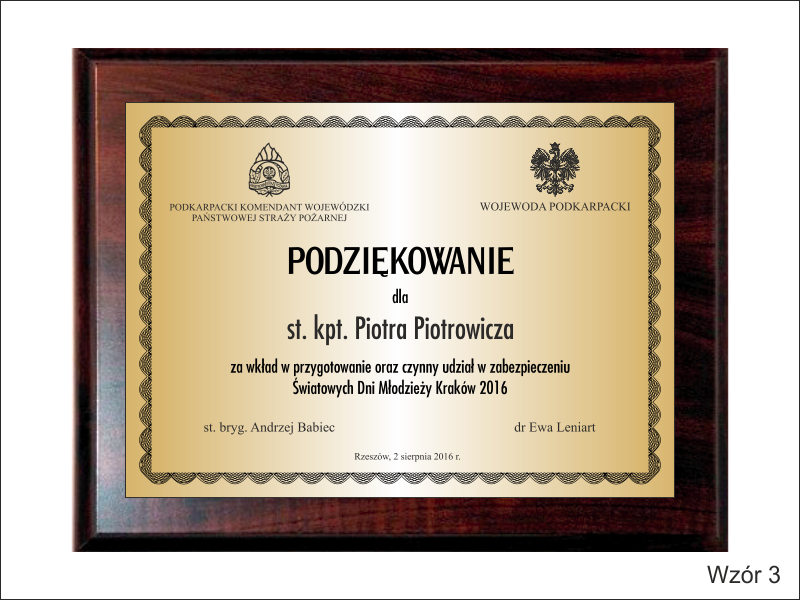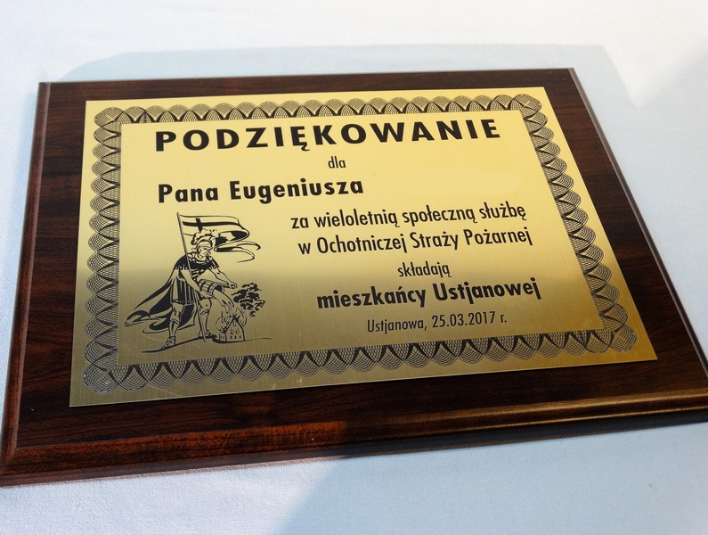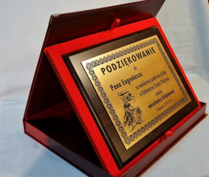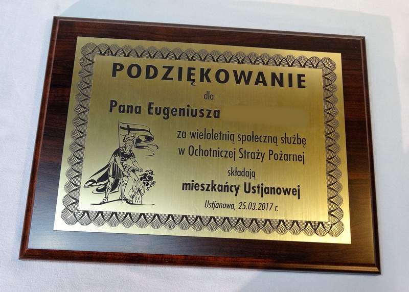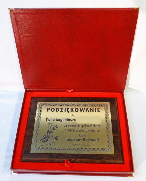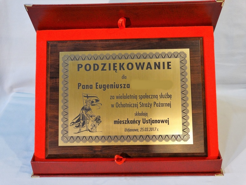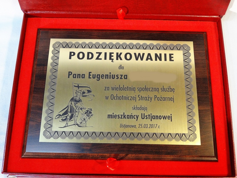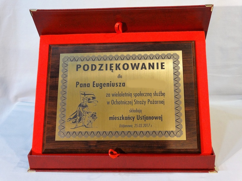 Podziękowanie za służbę dla Strażaka w postaci drewnianego dyplomu okolicznościowego z grawerem.