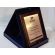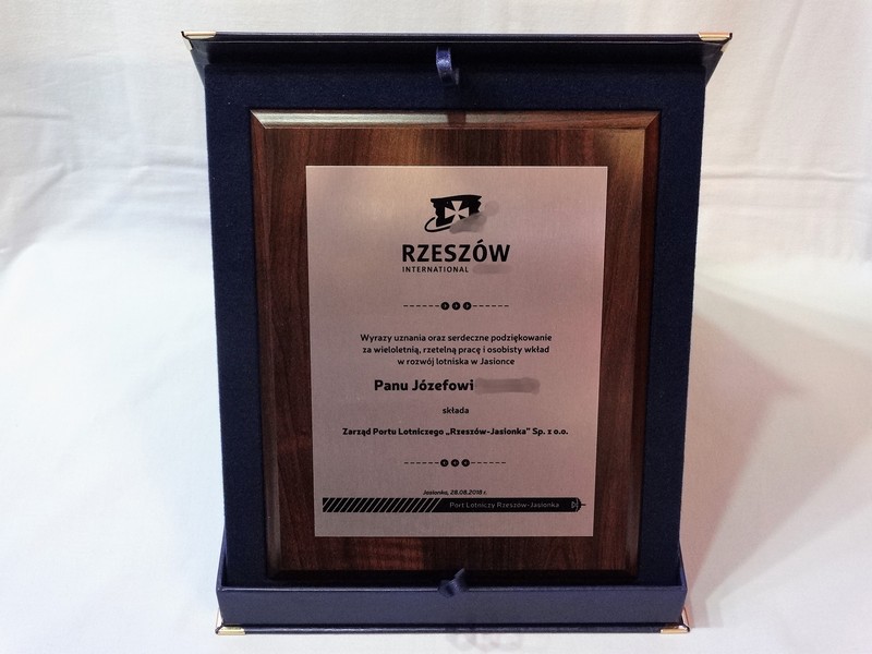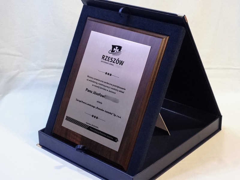 Podziękowanie za pracę w postaci dyplomu okolicznościowego na drewnianym podkładzie ze srebrną blaszką z nadrukiem.