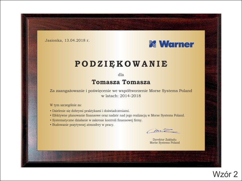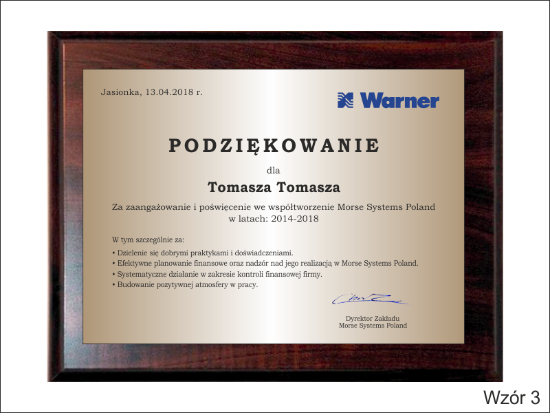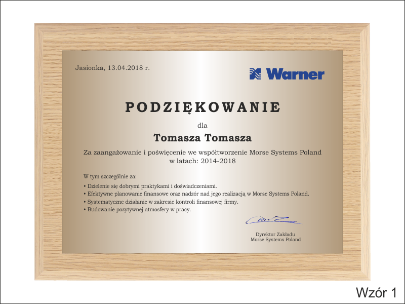 Podziękowanie za pracę w formie drewnianego dyplomu okolicznościowego na drewnianym standardowym podkładzie z blachą z nadrukiem.