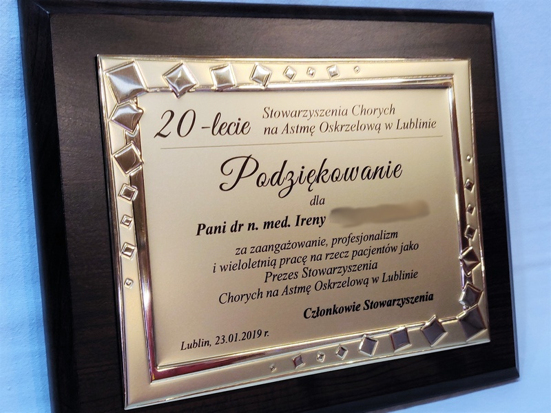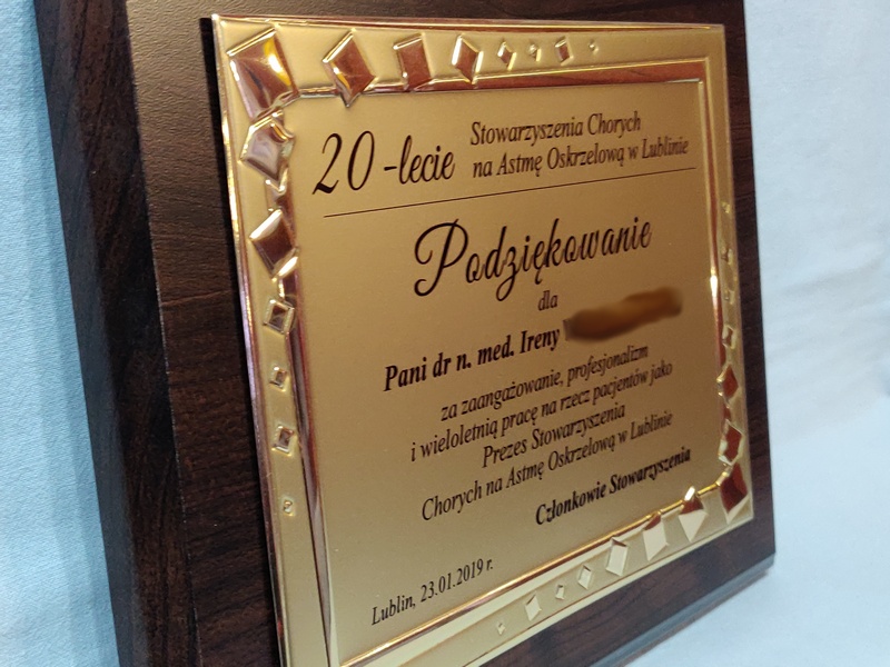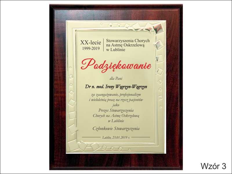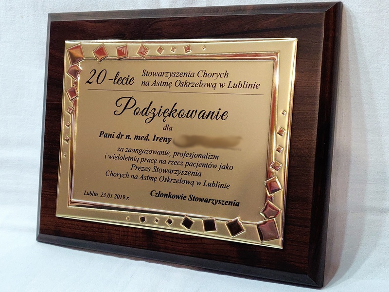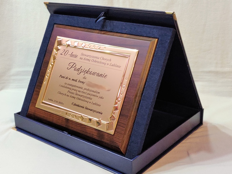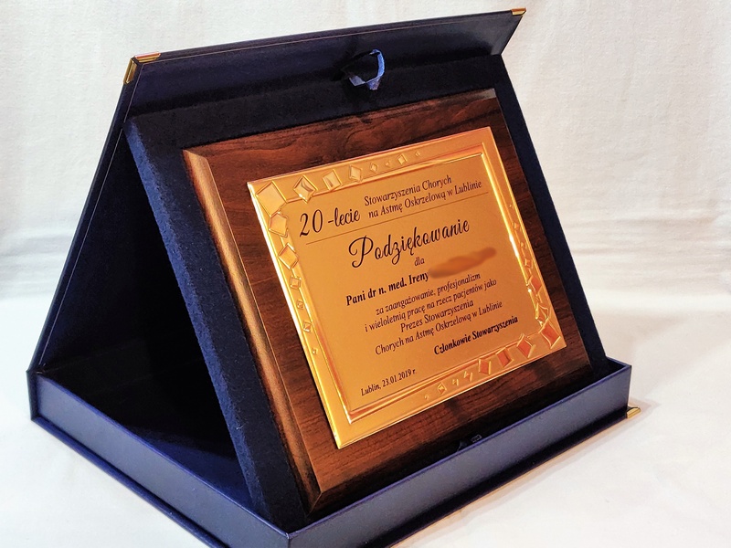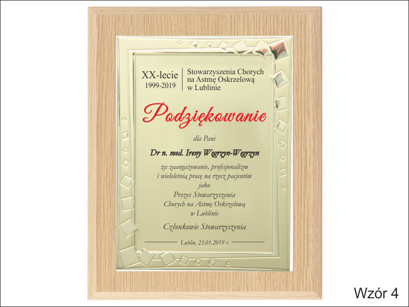 Podziękowanie za zaangażowanie i pracę w postaci drewnianego dyplomu okolicznościowego na standardowym podkładzie z złotą paterą z nadrukiem.