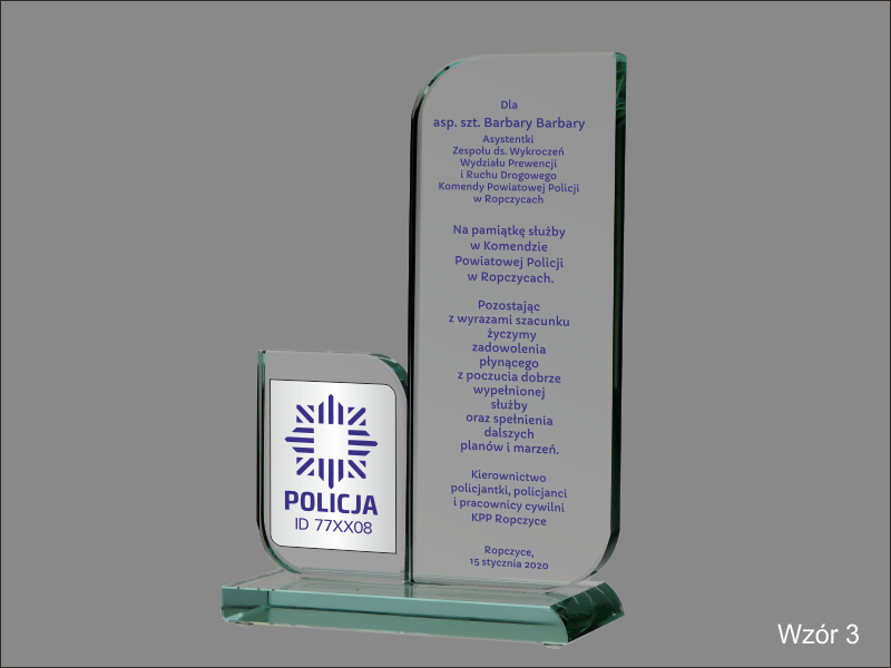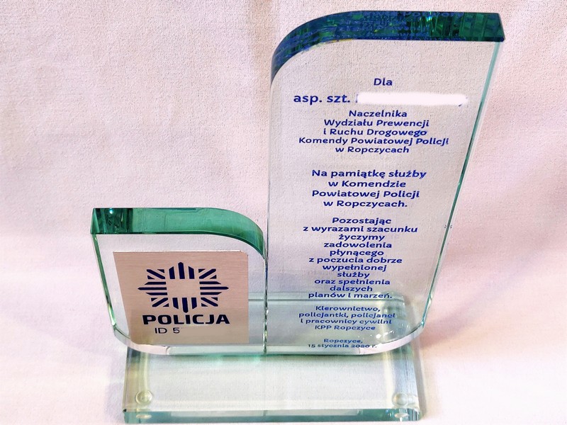 Grawer z okazji zakończenia służby czy emerytury można wykonać także na innych modelach statuetek szklanych.