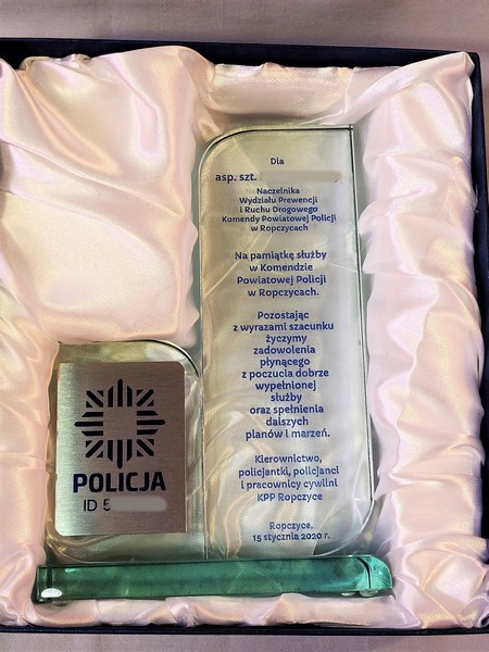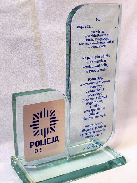 Na statuetce wykonany jest grawer okolicznościowej dedykacji z podziękowaniem za wspólnie wykonywaną służbę.