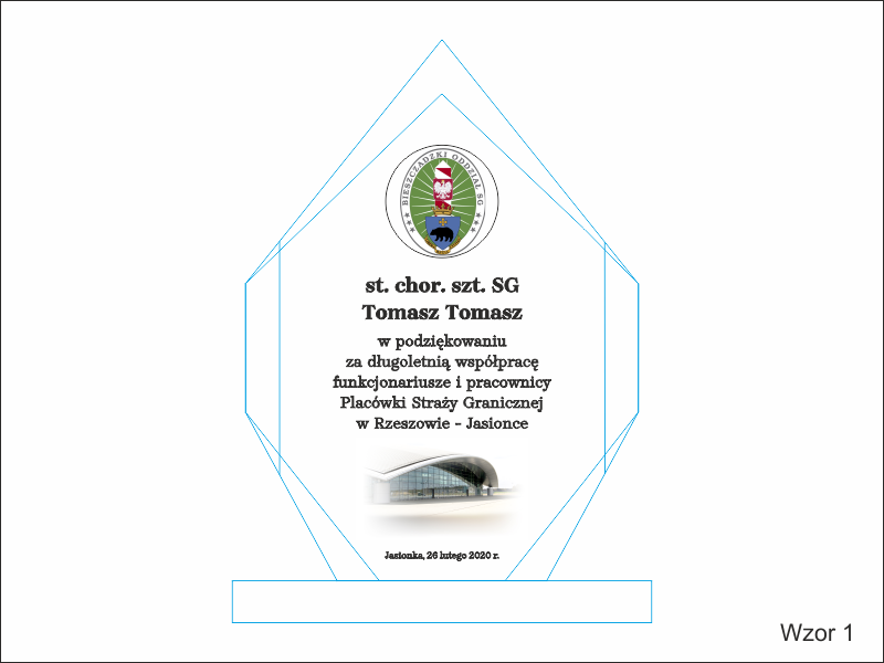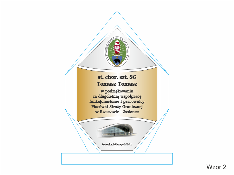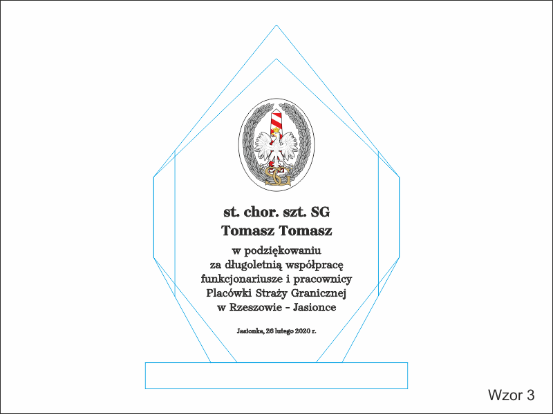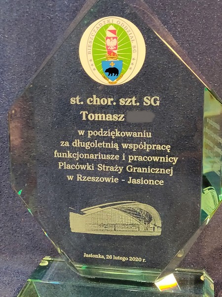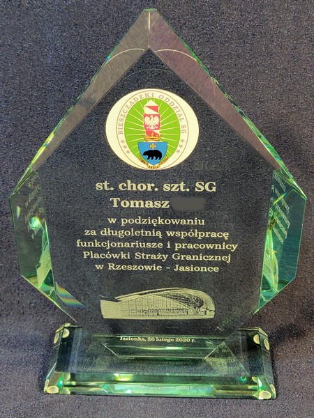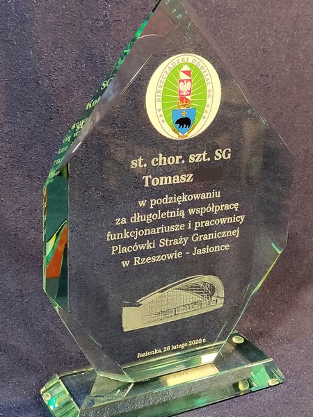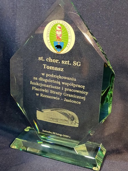 Na statuetce wykonany jest grawer okolicznościowej dedykacji z podziękowaniem za współpracę i służbę.