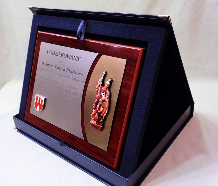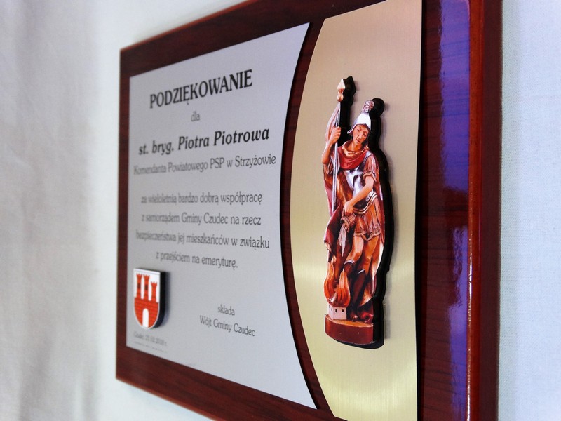 Dodatkowe elementy: figurka Św.Floriana oraz herb nadrukowane są na przyciętych na odpowiedni kształt laminatach.