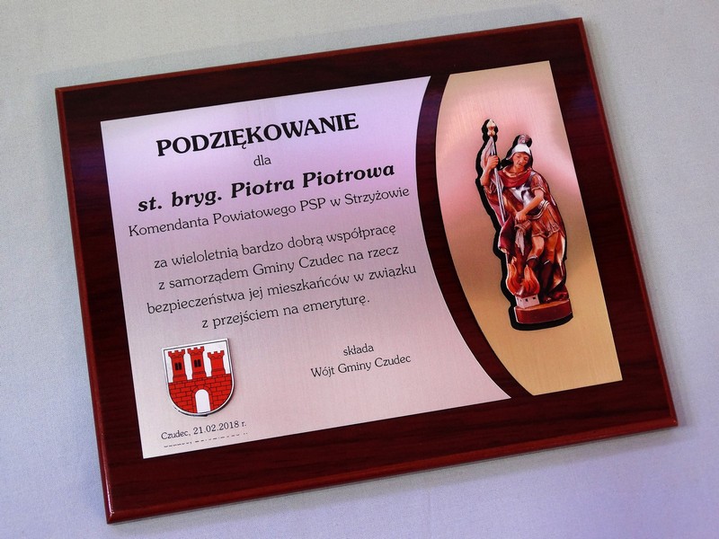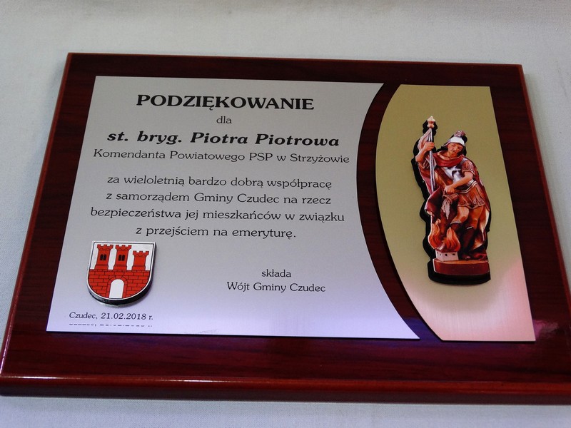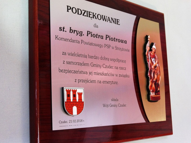 Podziękowanie za współpracę dla Strażaka z okazji przejścia na emeryturę w postaci złożonego dyplomu okolicznościowego.