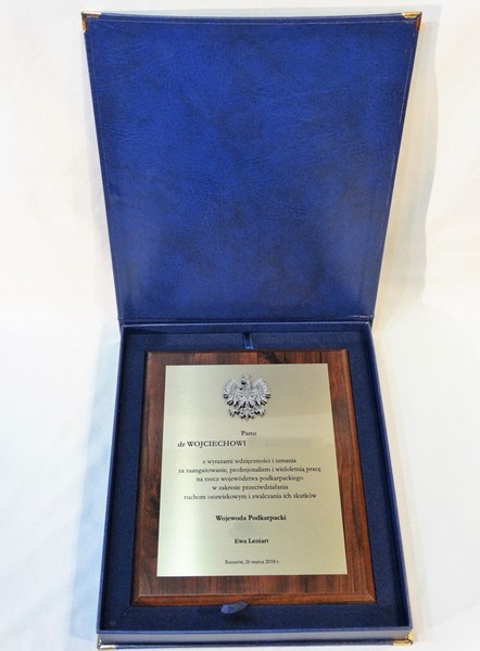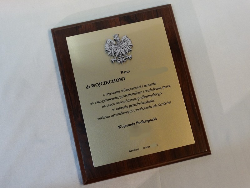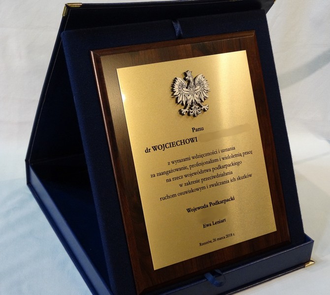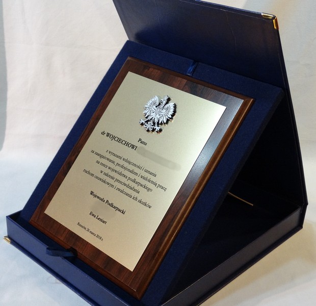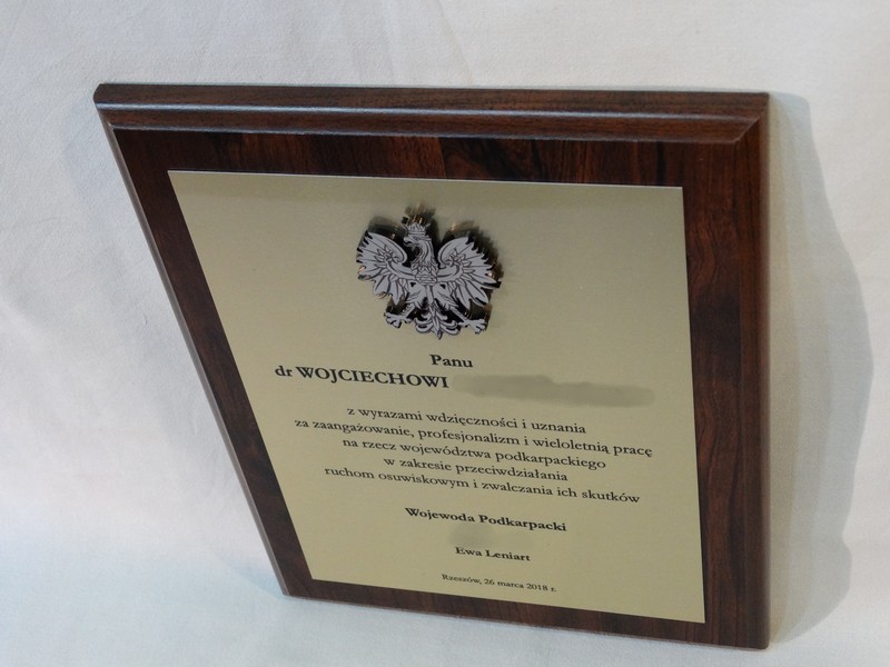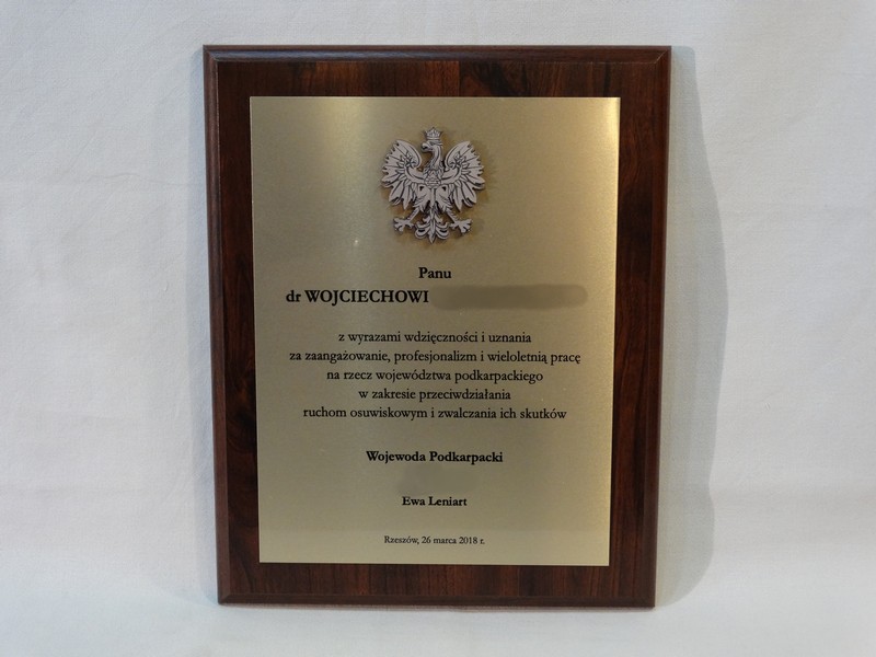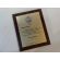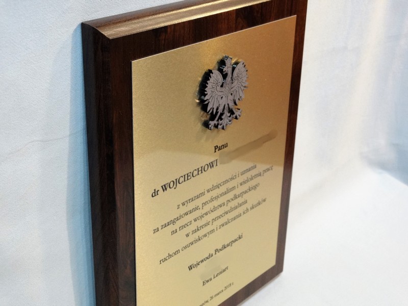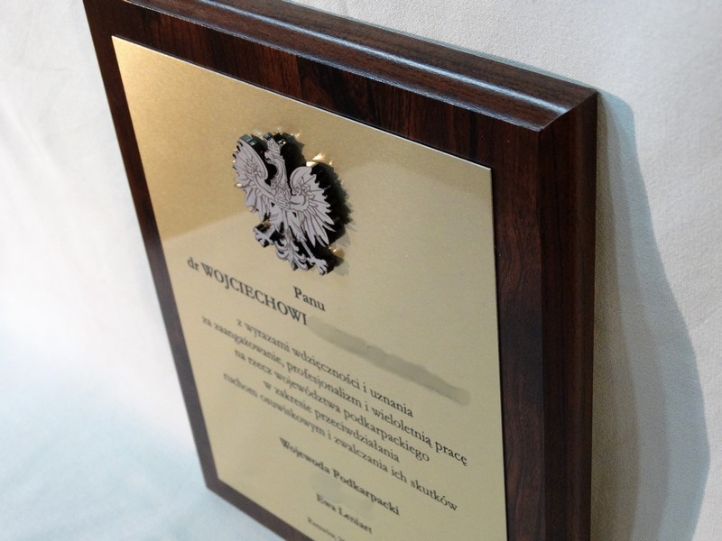 Podziękowanie za współpracę w postaci dyplomu okolicznościowego na drewnianym podkładzie z blaschą z nadrukiem oraz dodatkowym grawerowanym emblematem.