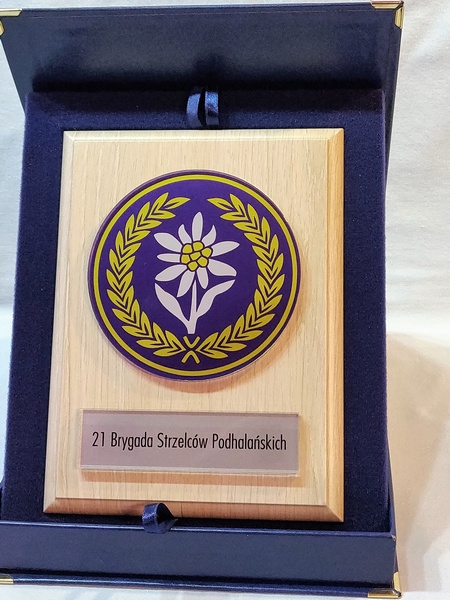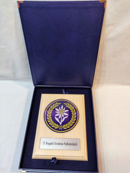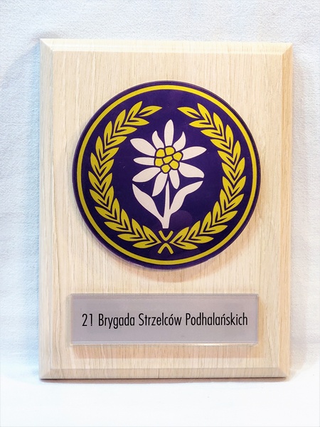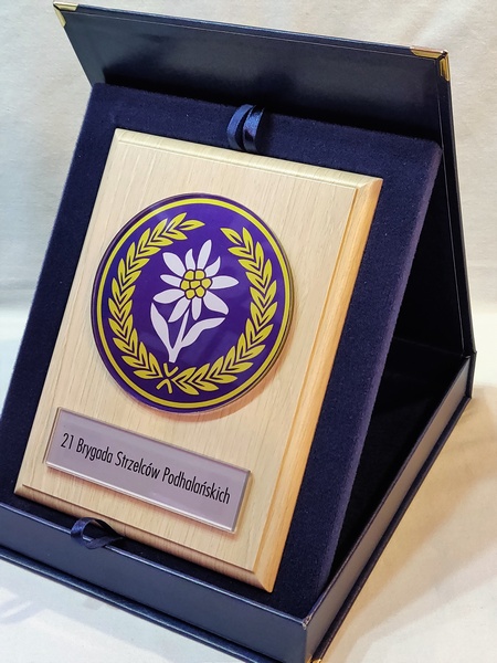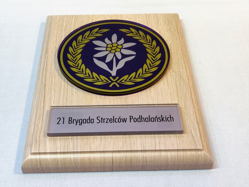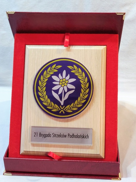 - z umieszczonej pod odznaką bezbarwnej pleksi z nadrukiem dedykacji,