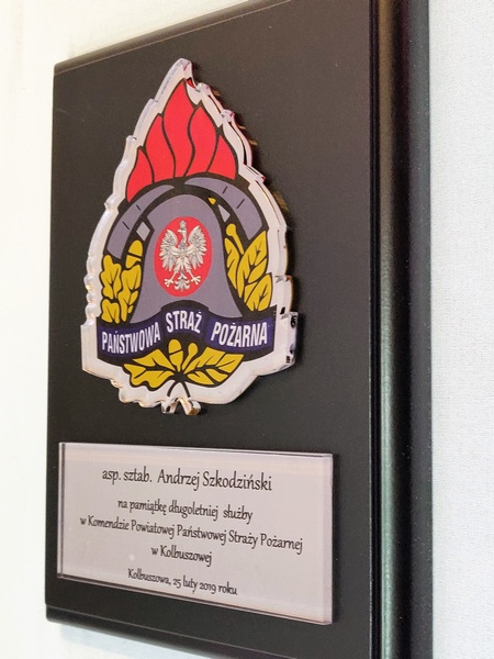 - z umieszczonej pod odznaką bezbarwnej pleksi z nadrukiem dedykacji,