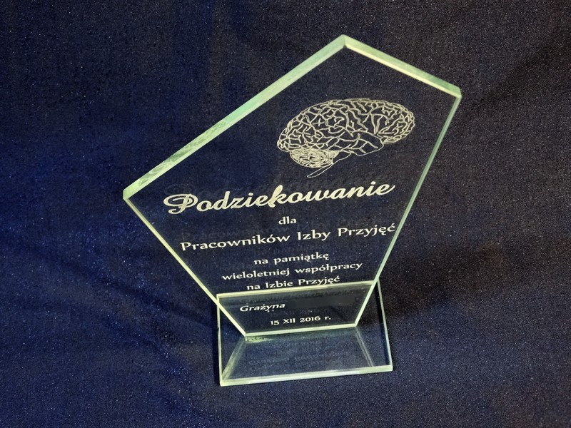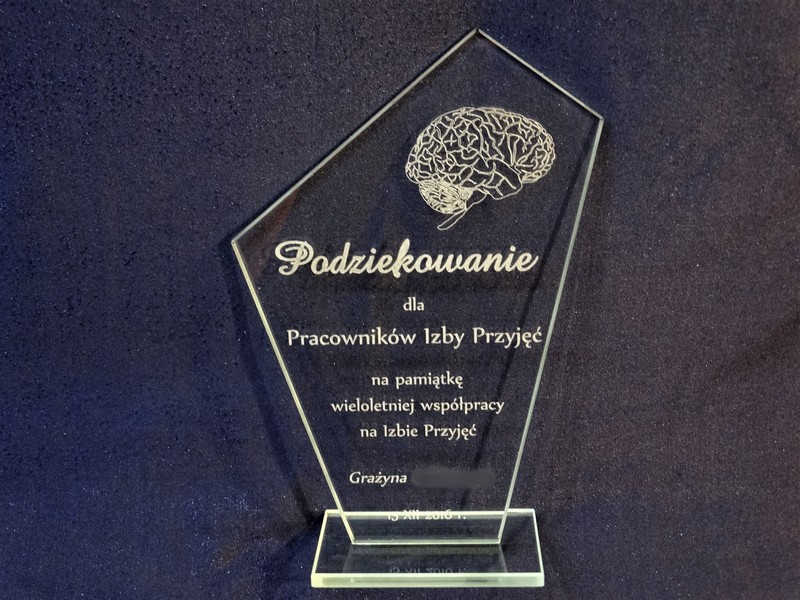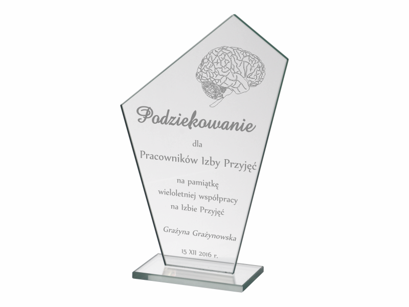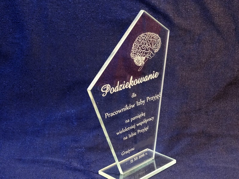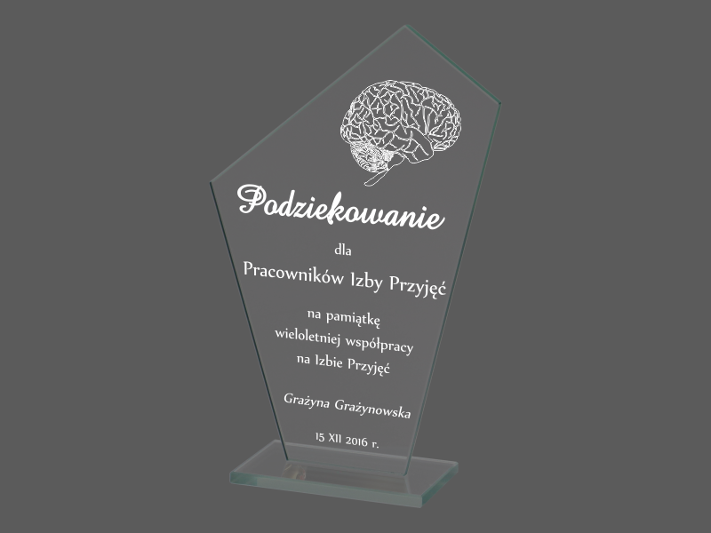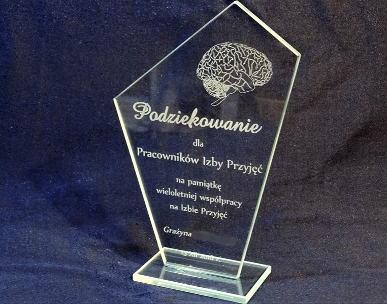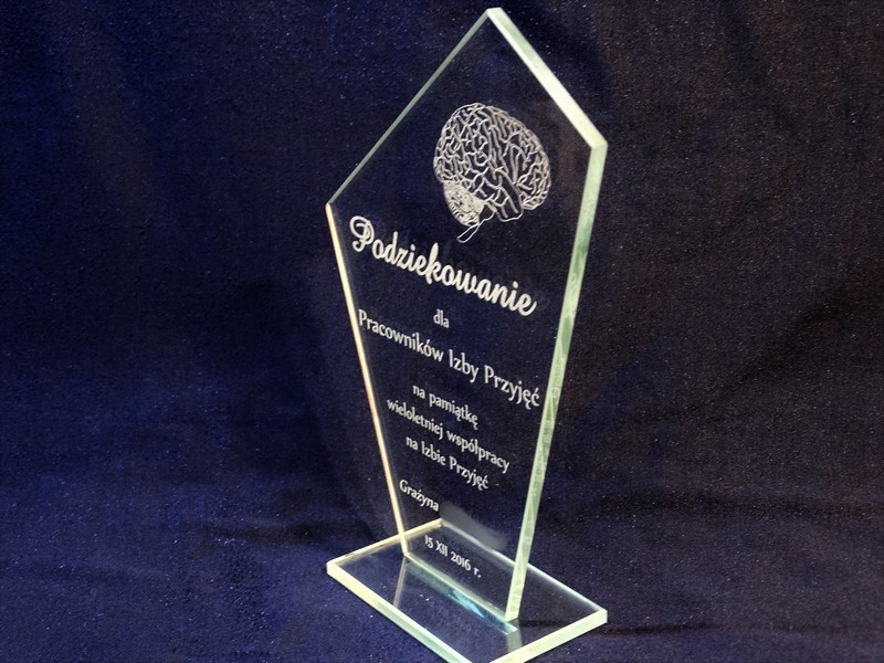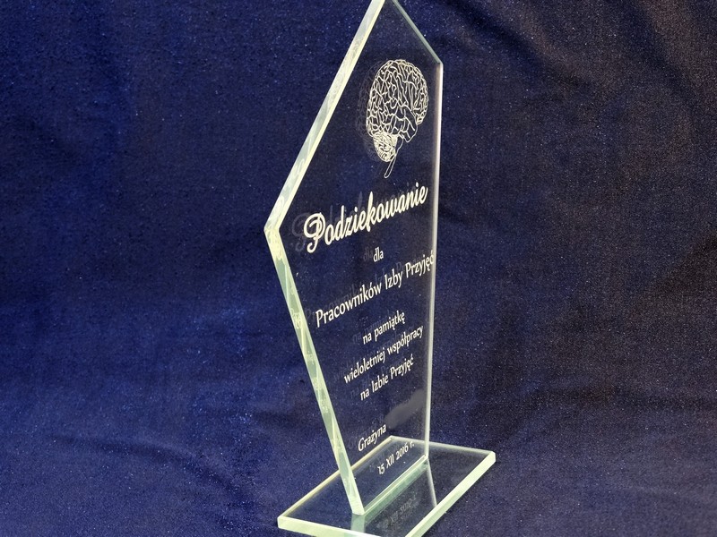 Statuetka szklana M64 z grawerem jako pamiątkowe podziękowanie za współpracę.