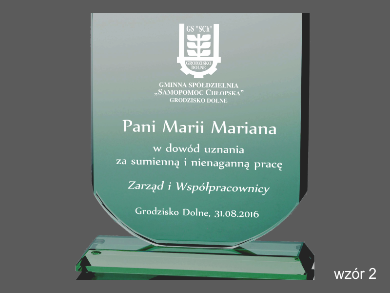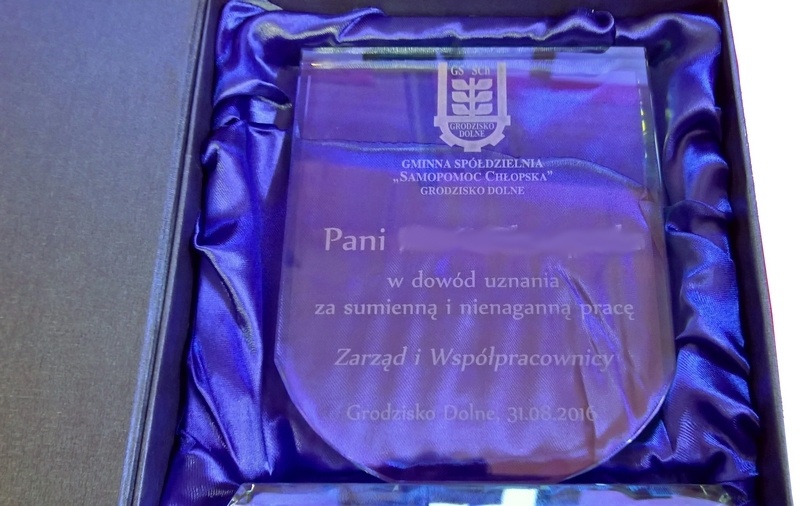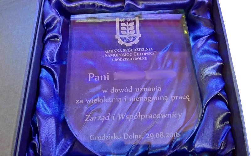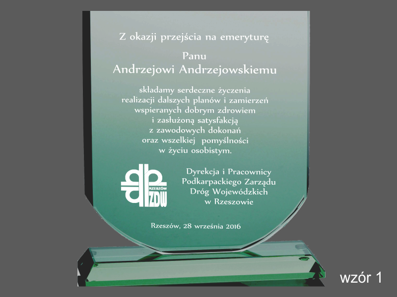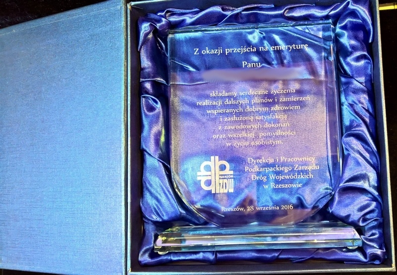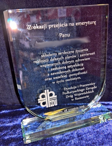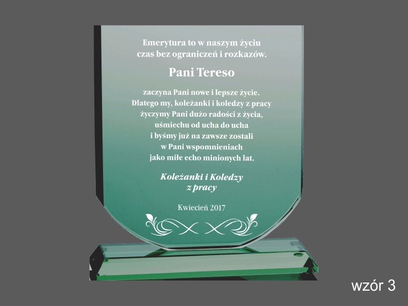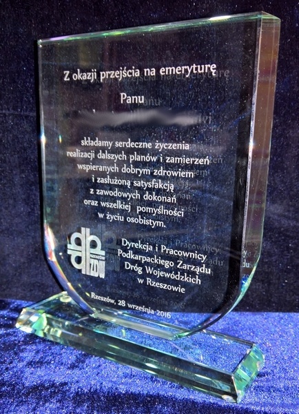 Można także wykonać pamiątkę "emerytalną" na innym modelu statuetki szklanej.